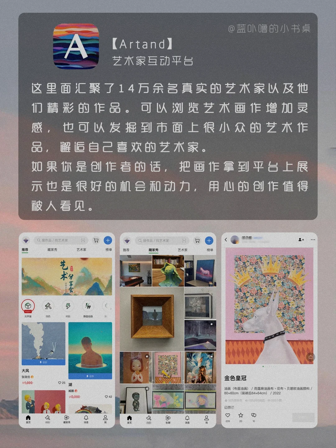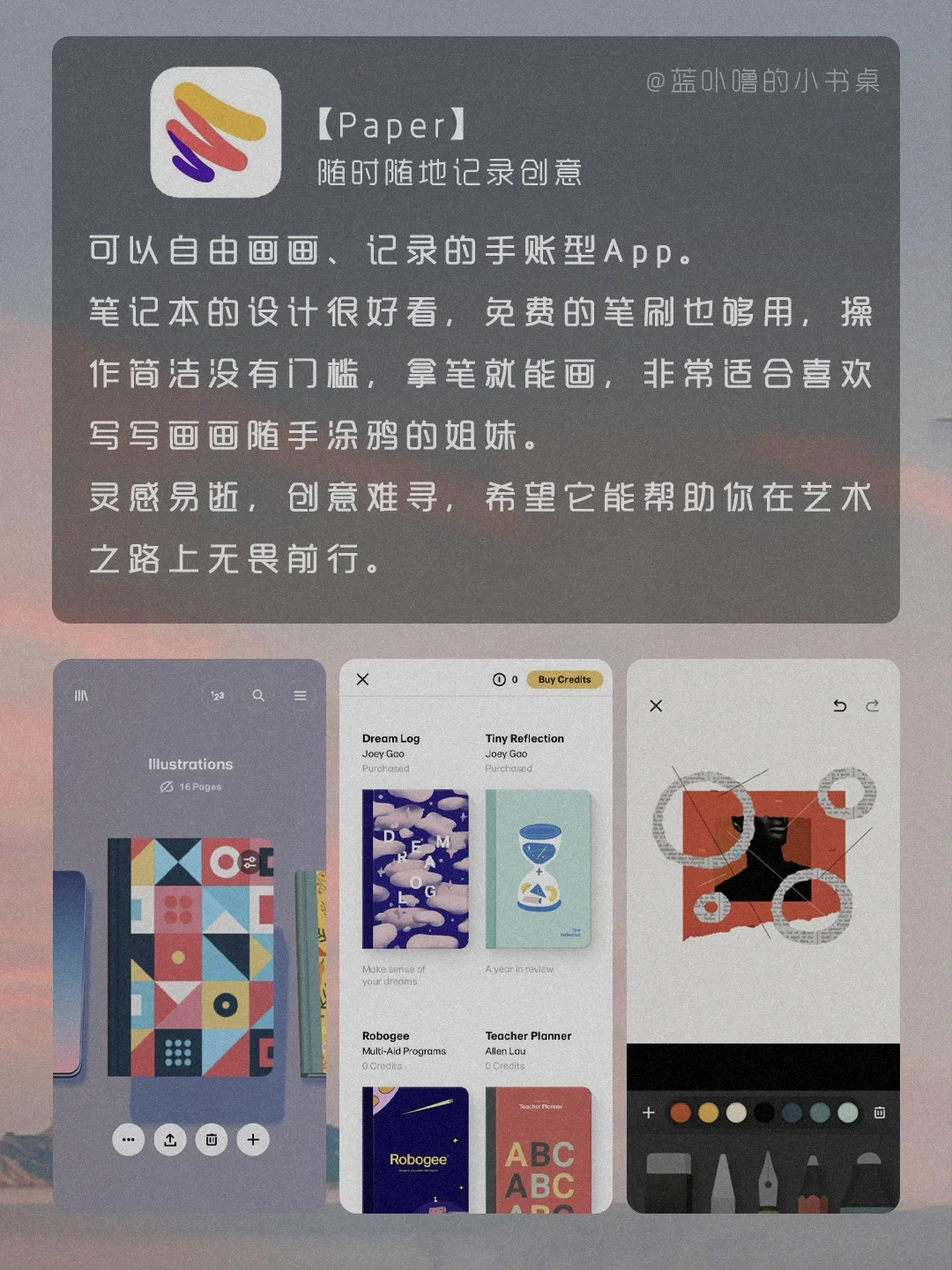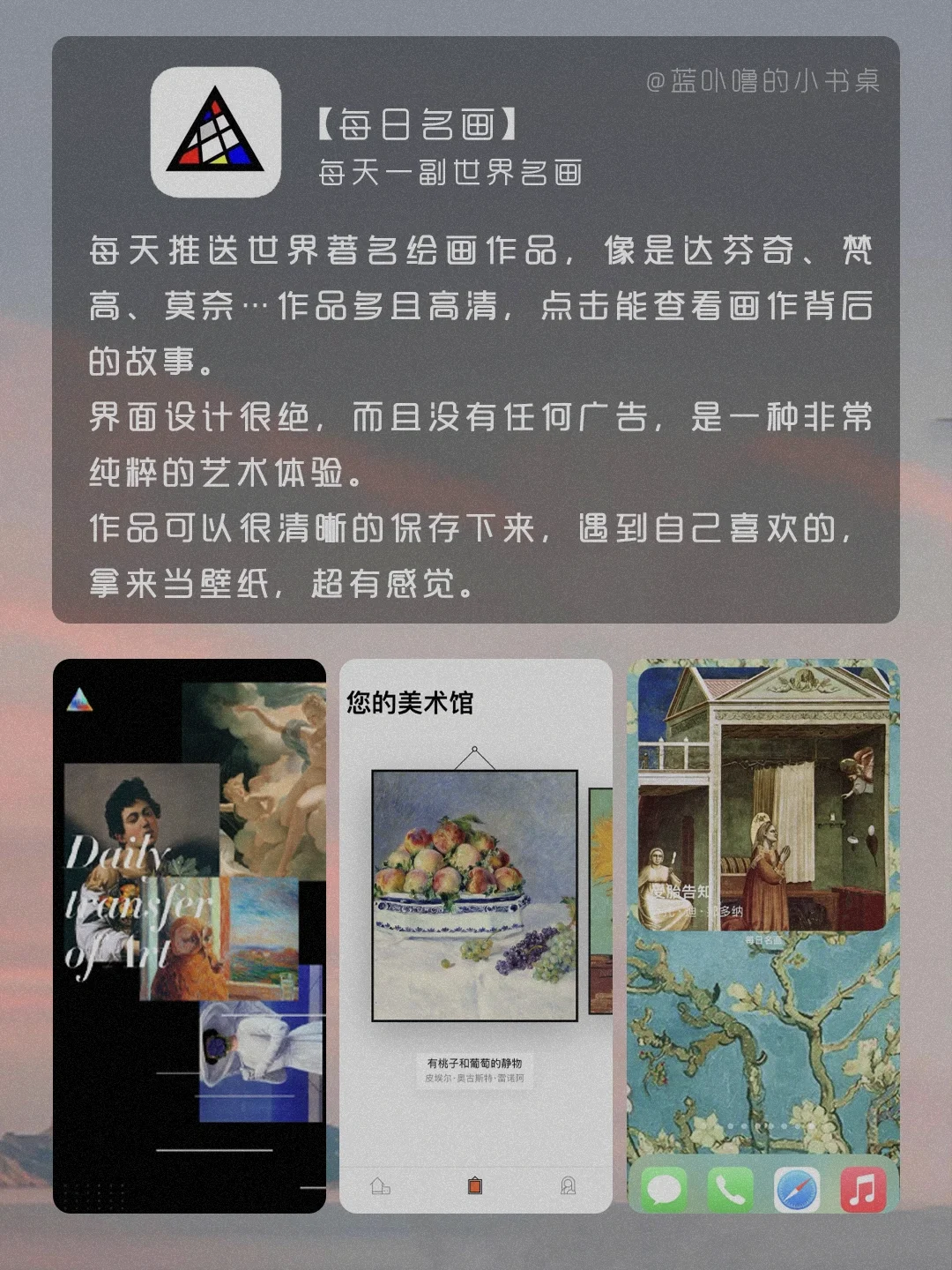 Hi,我是蓝卟噜的小书桌[飞吻R] 一些充满了艺术感的App, 给那些才华横溢的艺术生,灵感爆棚的设计师,还有热爱艺术的我们❤ 别让世俗埋没了艺术的浪漫🌇🌇🌇 🌅 每日名画 🌅Artand 🌅Paper 🌅DaDa-Collage maker 🌅在艺 🌅WikiArt 🌅DailyArt