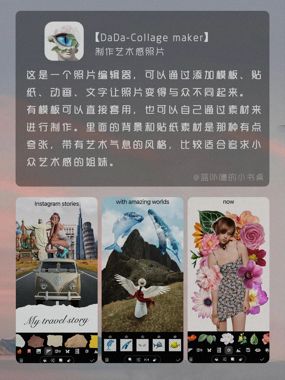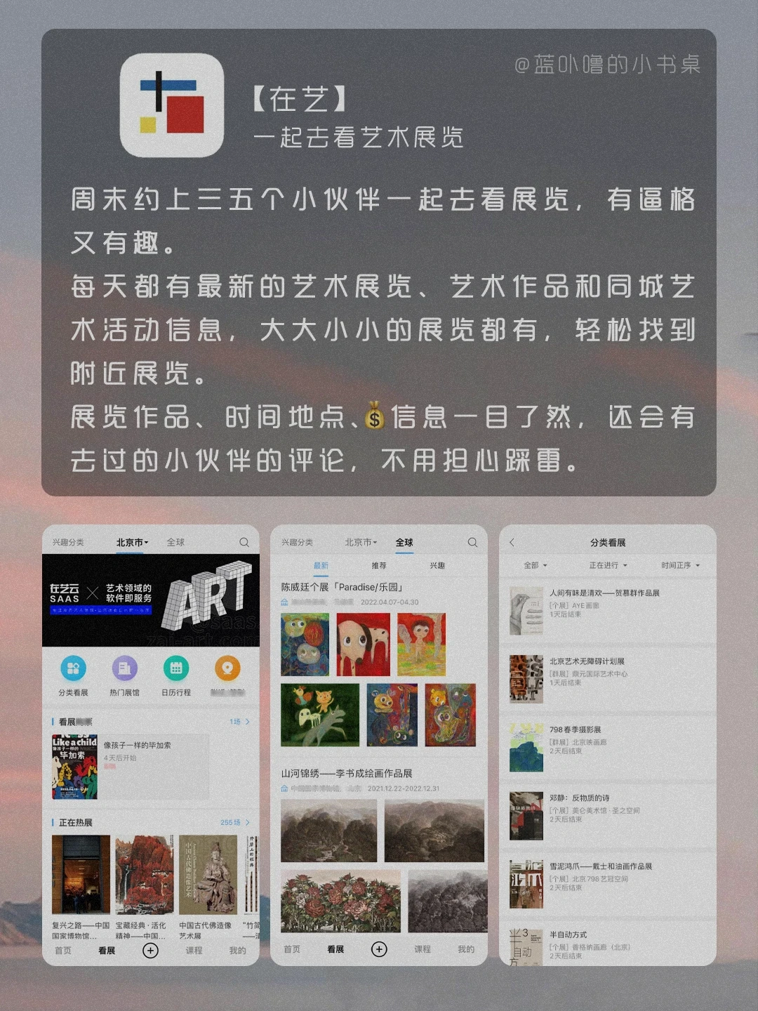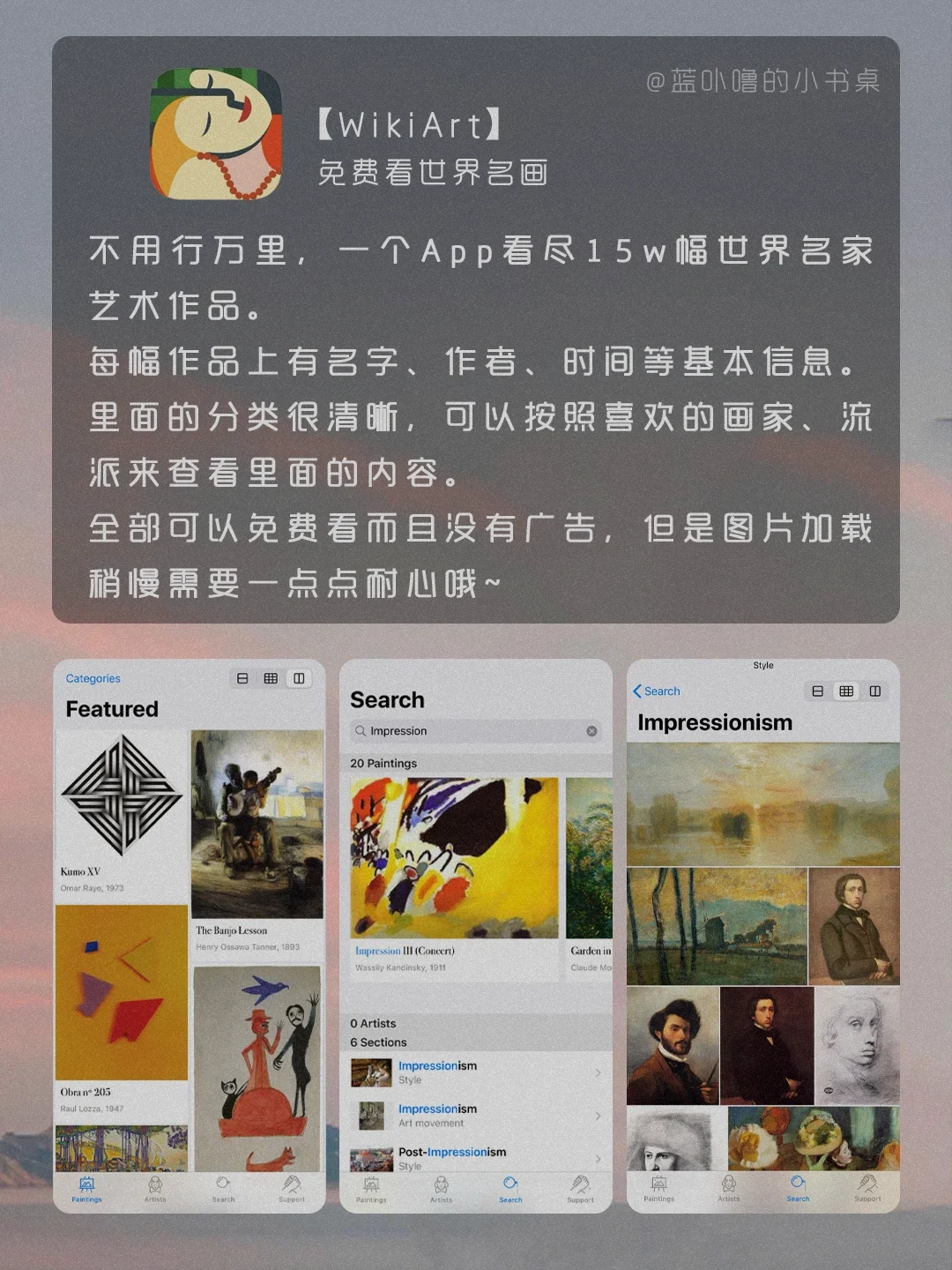 Hi,我是蓝卟噜的小书桌[飞吻R] 一些充满了艺术感的App, 给那些才华横溢的艺术生,灵感爆棚的设计师,还有热爱艺术的我们❤ 别让世俗埋没了艺术的浪漫🌇🌇🌇 🌅 每日名画 🌅Artand 🌅Paper 🌅DaDa-Collage maker 🌅在艺 🌅WikiArt 🌅DailyArt