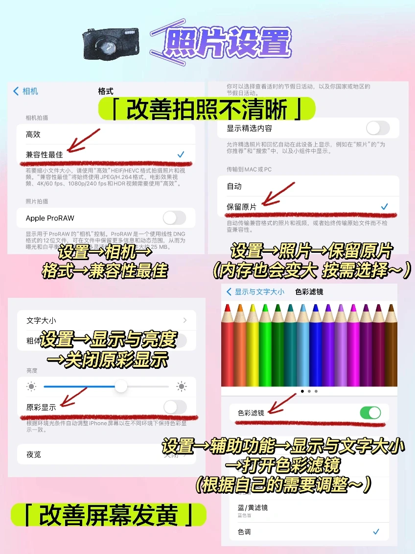 家人们,让我康康有谁新iPhone到手,没有做这些设置[暗中观察R] 跟着图操作一下,真的会让手机更好用哦~ 👉🏻拍照设置 改善拍照不清晰和屏幕发黄的情况 👉🏻隐私设置 👉🏻防丢设置 丢手机也不怕 👉🏻电池设置 更省电,电池保养用更久哦~ 👉🏻其他设置 改善打字卡顿、手机发烫、听筒声音小的问题 宝子们可以下方告诉我, 你的第一台苹果是什么型号呀[哇R]