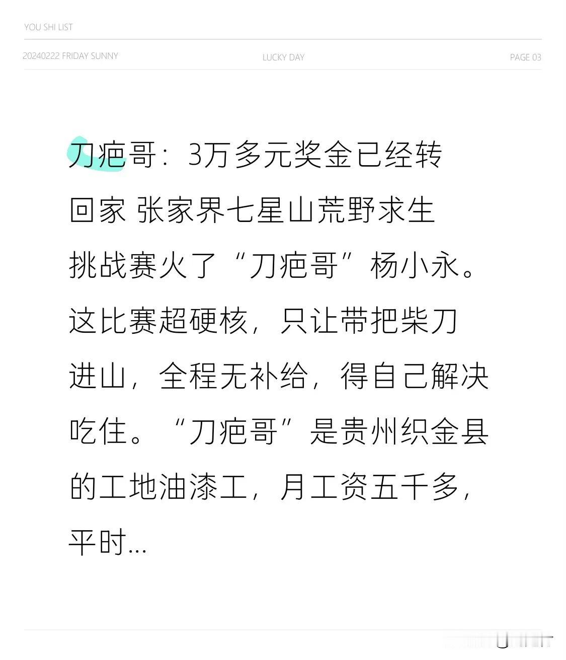 刀疤哥:3万多元奖金已经转回家 刀疤哥:3万多元奖金已转回家 张家界七星山荒野求生挑战赛让“刀疤哥”杨小永走红。这场比赛极为硬核,选手仅允许携带一把柴刀进山,全程无补给,吃住都需自行解决。“刀疤哥”是贵州织金县的工地油漆工,月工资五千多元,平日省吃俭用,常往家里寄钱。 比赛中,他搭建简易庇护所熬过几晚,脸上的疤痕成了他的独特标志。此前网上传言他参赛是为给重病父亲治病,实则父亲只是耳聋。11月21日,他拿到3万多元奖金并转回家中。他表示决赛最大的考验是食物。他参赛如同为自己打开新通道,普通人努力改变生活的劲头令人感同身受。 荒野求生比赛 七星山荒野挑战 张家界户外求生 荒野刀疤哥 成都荒野求生赛
