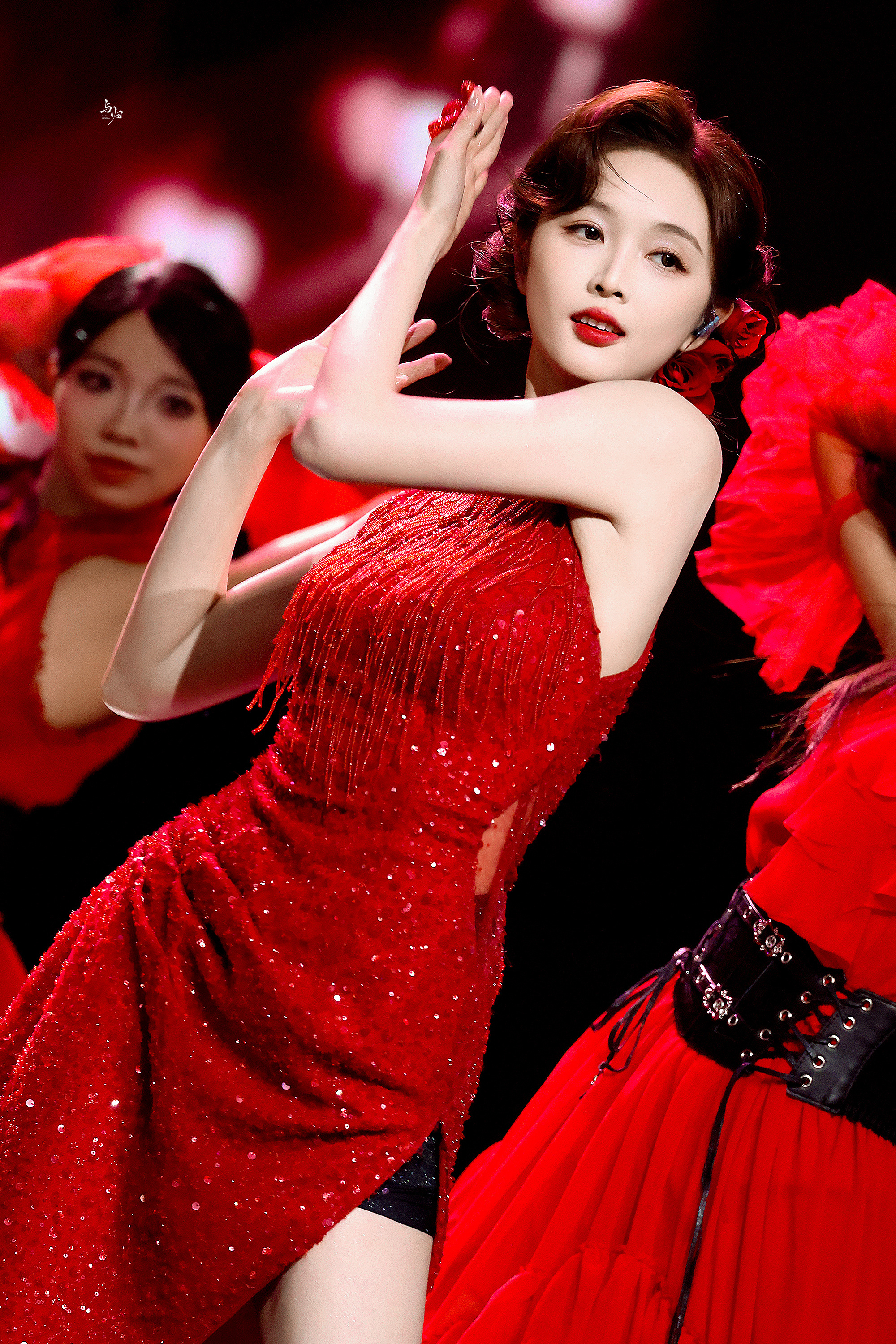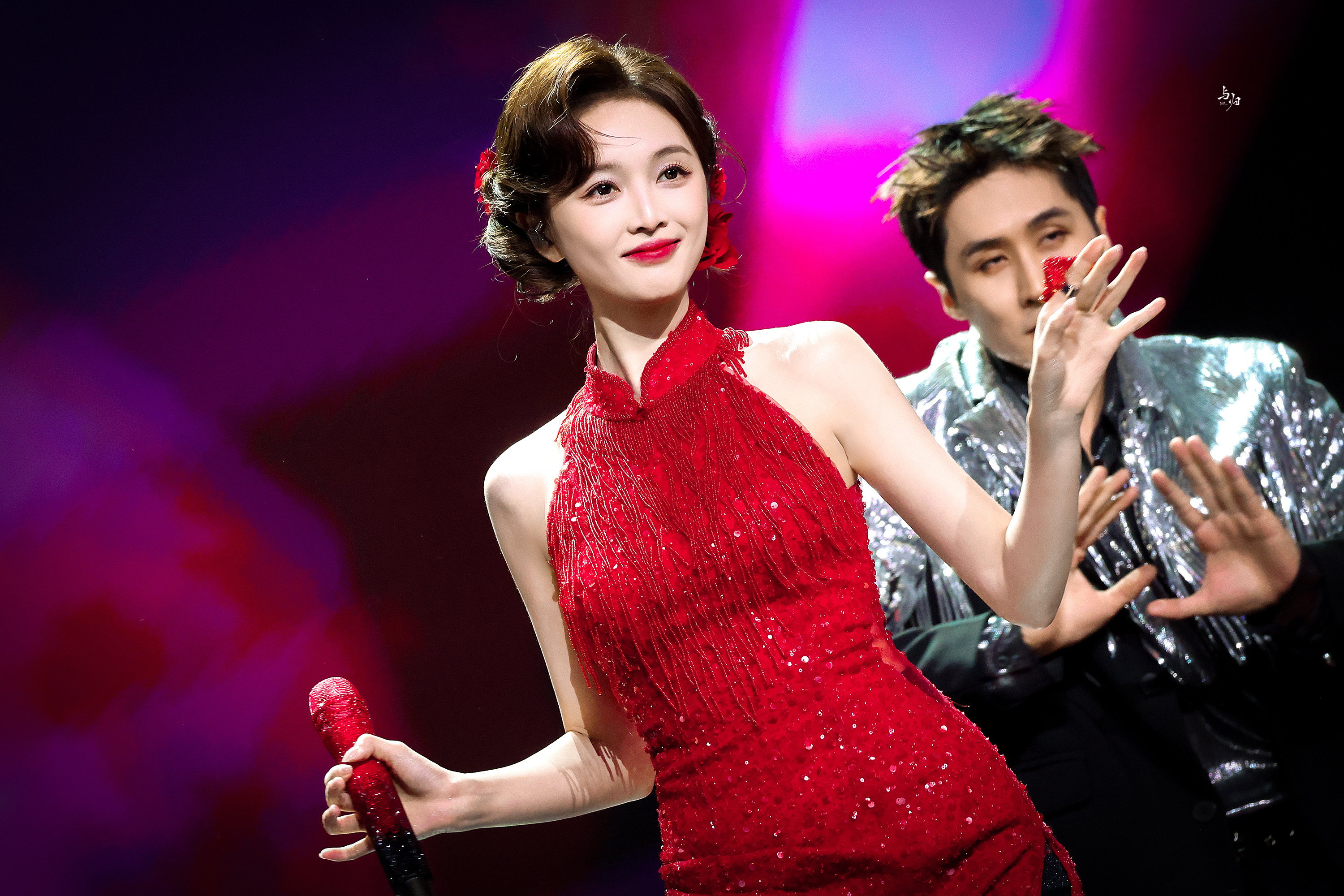 吴宣仪 红裙缀星,开衩露膝,身段裹在旗袍韵里,抬眼是艳而不媚的柔。