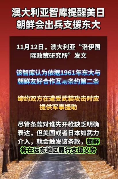 澳大利亚智库提醒:如日本武力介入台海,朝鲜必参战!日本武力介入将会自动触发《中朝友好合作互助条约》中的共同防御条款! 麻烦看官老爷们右上角点击一下“关注”,既方便您进行讨论和分享,又能给您带来不一样的参与感,感谢您的支持! 这条约可不是摆设,它里面明明白白写着“共同防御条款”。翻译成人话就是,如果一方受到攻击,另一方有义务支援。 日本一旦动手,朝鲜撑腰,不只是口头喊喊那么简单,真的会拿出军事手段来。你想啊,日本自二战后一直小心翼翼地保持自卫队的存在,平时军力虽然不算弱,但在朝鲜和中国的双重压力下,那可就不是开玩笑的了。 而且别忘了,中朝之间还有一层历史情感加持。朝鲜对日本可是有着深深的历史记忆,从殖民到战争,多少仇恨和情绪累积下来,哪怕今天口头上不提,这种心理底色仍然影响决策。 日本军机一旦越线,朝鲜不出手?几乎难以想象。而这种情绪上的推动,加上条约的法律约束,再加上战略上的互信,三管齐下,朝鲜参战的概率就几乎成了必然。 讲到战略互信,这里值得强调一下。朝鲜可不是随便喊喊口号的,它一直有一套自己的核威慑和常规军力布局。 几十年来,中朝在军事交流、情报共享上都是有迹可循的,任何武力摩擦前,都有默契在先。换句话说,日本若真插手台海,朝鲜不仅会参战,而且可能出手很有章法,形成对日本的双重压力。 什么双重压力?一方面是朝鲜本身的火力覆盖,一方面是中方的军事存在。这两股力量叠加,对日本来说绝对不是小数字。 别以为这只是理论推演,其实在国际政治里,很多冲突都是在这些条约、情绪、战略互信的组合下被“硬生生推动”的。 你可能觉得台海离我们挺远,但只要日本参战,局面瞬间复杂化,区域安全链条就可能被撕开,甚至波及全球经济和安全。这不只是军事问题,还带着浓浓的政治和经济味道。 周边国家必须算账,投资者得担心市场,国际社会得担心航运和贸易。你看,台湾海峡一热,连澳大利亚智库都急着提醒,背后就是全球视角下的忧虑。 再往深里看,日本自己也有难题。要武力介入台海,国内政治得稳,军力得够,经济和后勤得撑得住。 可现实是,日本现在的军力配置是针对防御和区域应急,面对中朝联合的潜在威胁,压力会立刻放大。 简单说,日本若动手,不只是和中国较劲,还得面对朝鲜可能的直接参战,压力翻倍,风险翻倍,成本也翻倍。这个杠杆效应,对战略判断来说是一个硬指标。 说到这里,你可能会问,朝鲜参战到底意味着什么?这里的参战不是随便派几个火箭军去秀肌肉,而是可能会形成完整的战术协同。 如果中方军事力量在台海周边布阵,朝鲜在北部海域或者对日防线出手,日本几乎要在两条战线同时应对。 战略上这叫做“夹击”,战术上叫做“压力倍增”,心理上更是巨大的震慑。这个组合让任何想插手的国家都必须三思。 还有一点特别有意思,条约不仅是纸面上的约束,它还是心理战的一部分。条约存在的意义之一就是让潜在的对手知道,你动我朋友,你就得同时面对两股力量。 这种震慑作用,有时候比实际行动还管用。朝鲜参战的可能性被智库强调,也是一种信息传递,告诉日本和其他可能“冒险”的国家,介入台海可不是随便说说的事情。 日本武力介入台海,后果远比表面看到的复杂。中朝的条约义务、历史情感以及战略互信构成了三重保障,使朝鲜几乎必然参战。 这个参战,不仅是军事动作,更是一种全方位的压力释放,直接影响区域安全甚至全球格局。 台海从原本的局部摩擦,一旦掺入日本和朝鲜,马上升级成区域性甚至全球性的安全事件。这不是危言耸听,而是基于条约、历史、战略的逻辑判断。 所以,台海局势看起来像新闻里的几个字,但背后隐藏的是复杂的条约义务、历史记忆和战略考量。每一个动作,都可能让整个区域紧张指数飙升。 对外界来说,这是一个提醒,别以为台海只是中国和台湾之间的事,牵一发而动全身,日本、朝鲜、中方、美国甚至区域国家都可能被卷进来。这里面没有简单的赢家,只有全局考量和战略博弈。 日本动手的代价,不仅是和中国碰面那么简单,朝鲜会参战、条约会触发、历史情感会加码、战略压力会倍增,整个局面可能直接升级为区域甚至全球安全危机。