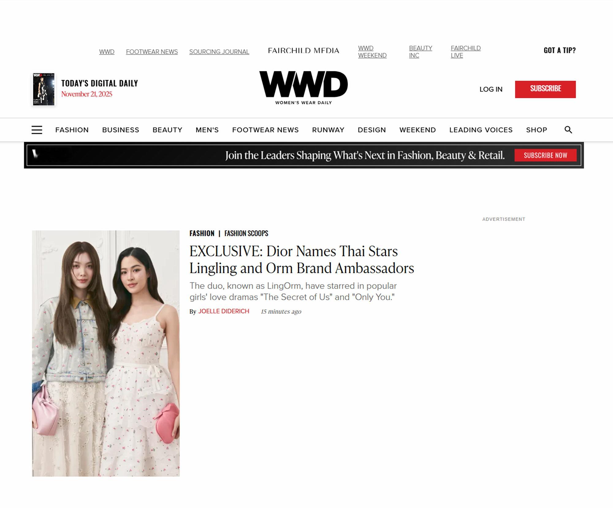 LingOrm | DIOR WWD 率先官宣 !Dior 双姝拿下合约 ,邝玲玲 、Orm Kornnaphat 正式加入 Dior 代言队伍 ,从杂志封面到时装周 ,从宣传拍摄到线下活动 ,紧密合作 ,完全可以说是水到渠成的结果