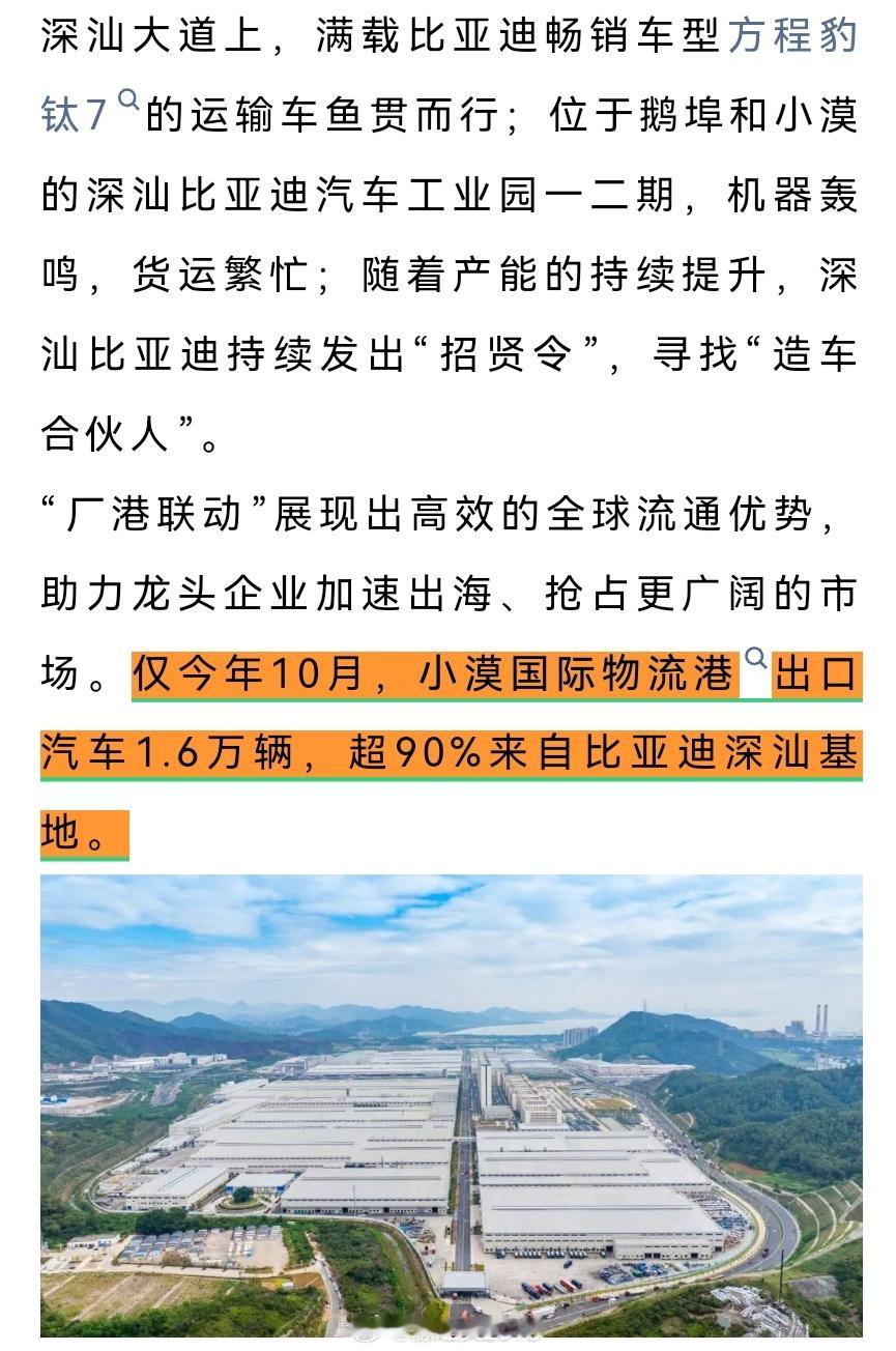 厂港联动,比亚迪深汕工厂经小漠港出口效率再提升!工厂→港口→码头(堆场),比亚迪与小漠港合作启动“全流程无人驳运”试点:安全可控、降本增效!10月份,小漠港出口整车1.6万辆,创历史新高!