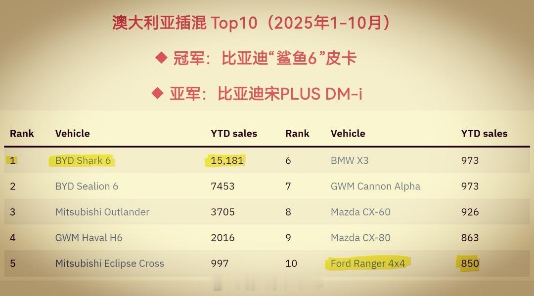 “鲨鱼6”皮卡底盘获准在澳大利亚单独销售,未来在澳或许能看到“鲨鱼”房车、旅行车等各式各样的“鲨鱼”改装车!25年1-10月,比亚迪“鲨鱼6”皮卡斩获澳大利亚插混销冠!
