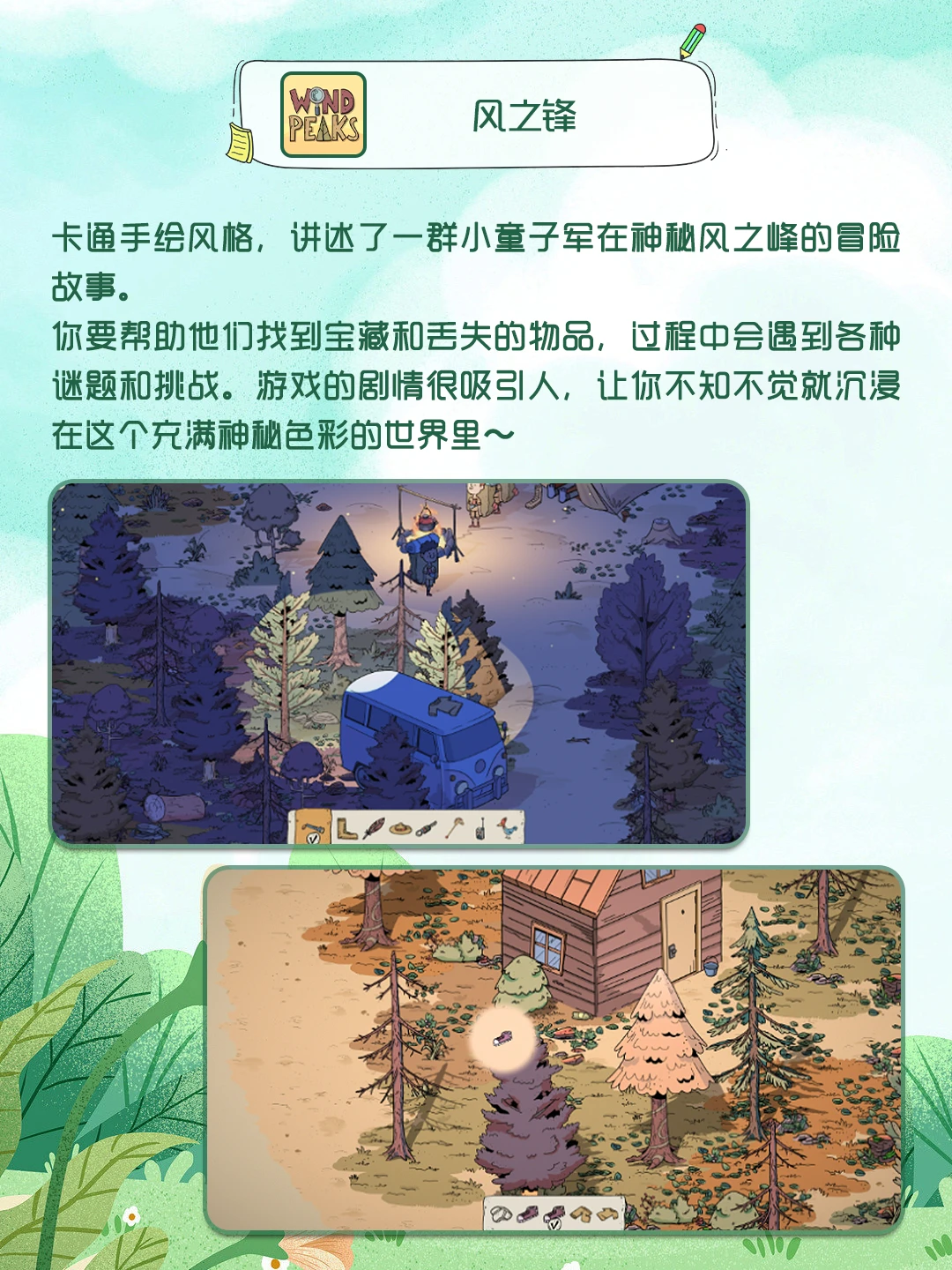风之锋-卡通手绘风格,讲述了一群小童子军在神秘风之峰的冒险故事。
