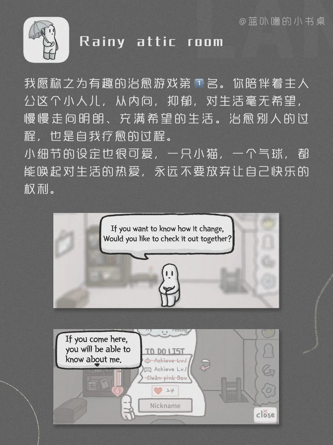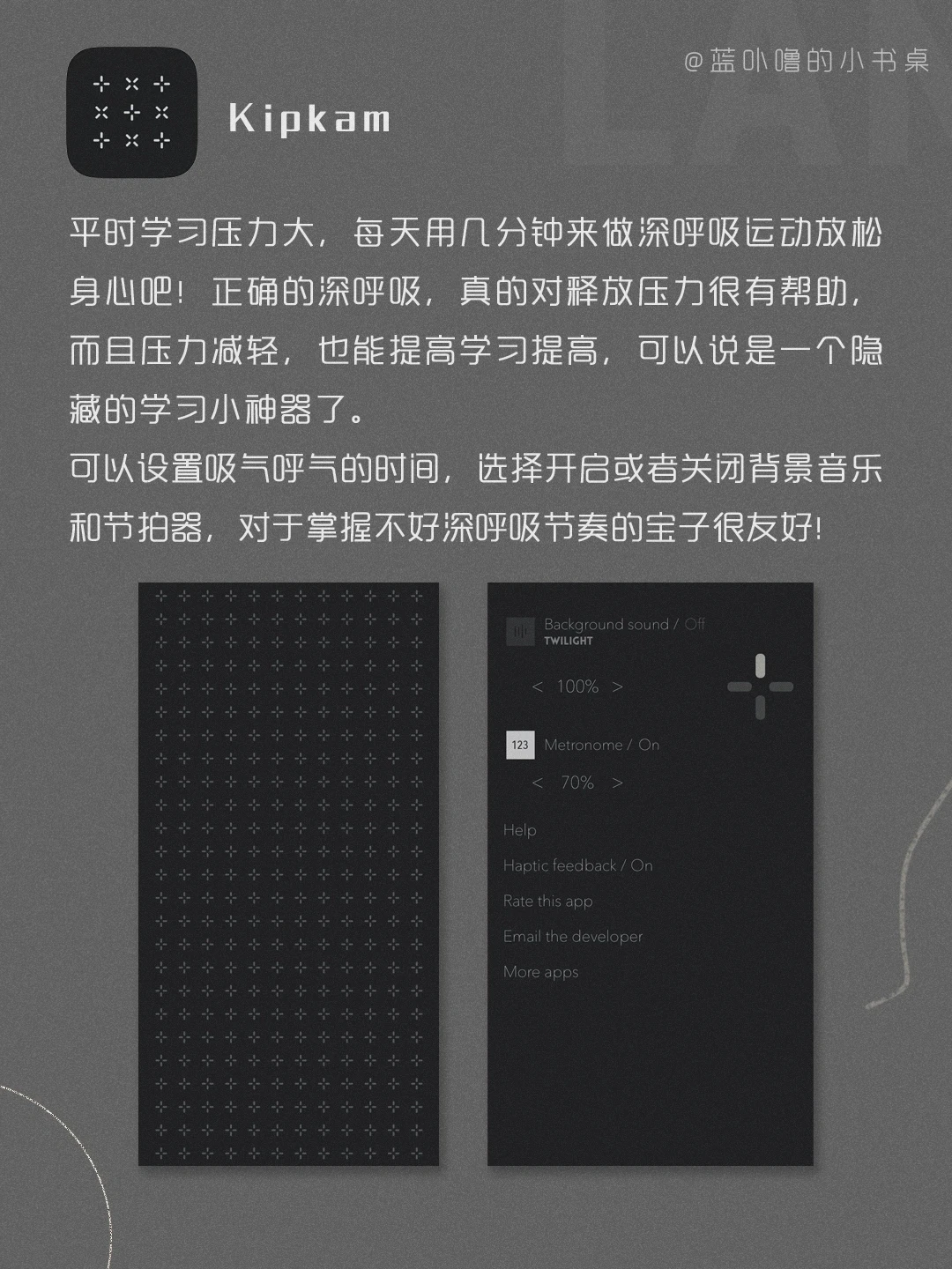 Hi,我是蓝卟噜的小书桌[斜眼R][斜眼R] 寒假来啦,大家准备怎么过呀,都立了什么Flag[doge][doge][doge] 一些小众有趣的App,给每个独一无二的你❤ 🖤Rainy attic room 🤍松能笔记本支架 🖤谁是凶手 🤍听电影 🖤Reverse专注沙漏 🤍Unfold 🖤Kipkam
