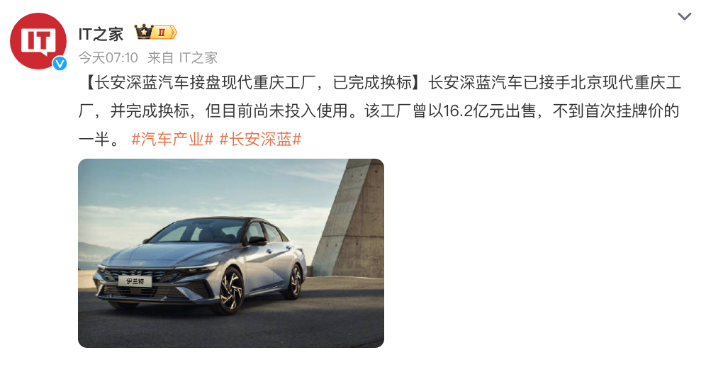 北京现代重庆工厂被传由长安深蓝接盘 ,对该消息深蓝汽车相关负责人表示:“有这个计