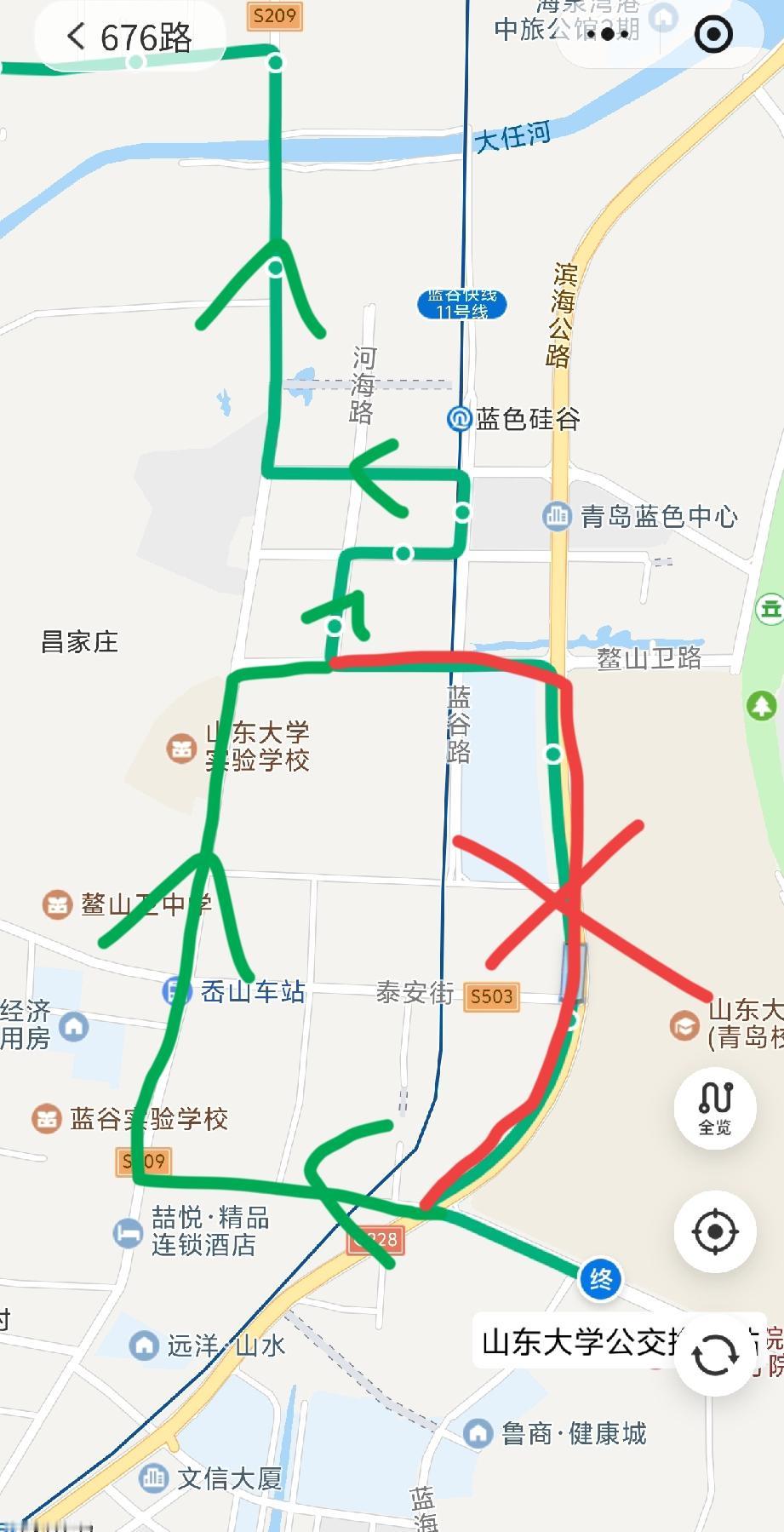 因莱青路(即墨区鳌山卫街道泰安街至山大路段)道路封闭施工部分结束,自2025年11月26日起,途经该路段的青岛676路(山东大学公交换乘站——水泊)公交线路恢复原路线行驶、原站点停靠,取消调流期间设置的临时站点。