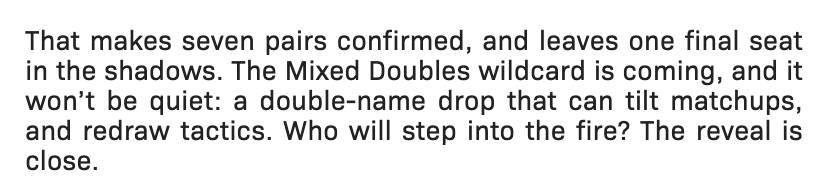 2025WTT香港总决赛丨混双参赛名单林诗栋/蒯曼🇨🇳、林钟勋/申裕斌🇰🇷、松岛辉空/张本美和🇯🇵、玛纳什·沙/奇塔莱🇮🇳、黄镇廷/杜凯琹🇭🇰、卡尔德拉诺/高桥·布鲁娜🇧🇷、罗伯勒斯/肖瑶茜🇪🇸WTT官网发文对于混双外卡选手的说明见图二,外卡最终人选将在总决赛开始前揭晓。