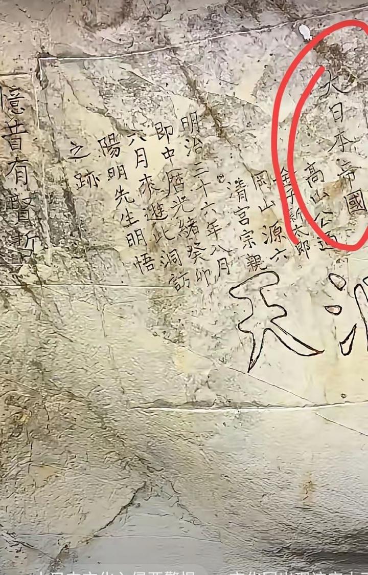 不久前有游客发现,在贵州贵阳,纪念王阳明的景区“阳明小洞天”石窟里,惊现“大日本帝国”字样,还有一长串日本名字, 景区解释说,这是1903年,日本的王阳明研究者镌刻的,属于文物,已经做出标记, 距今只有100多年,字迹歪歪扭扭,毫无书法意味,更像是“到此一游”之类的不文明私涂乱画,怎么就成文物了? 而且,大日本帝国是什么意思,熟悉近代史的都明白,这是一个消失的国号,一直是侵略和屠杀的代名词, 这样的东西,也不配当文物, 强烈要求贵阳方面,清除这个日本鬼子的痕迹,在中国的土地上,就不能有这个东西。