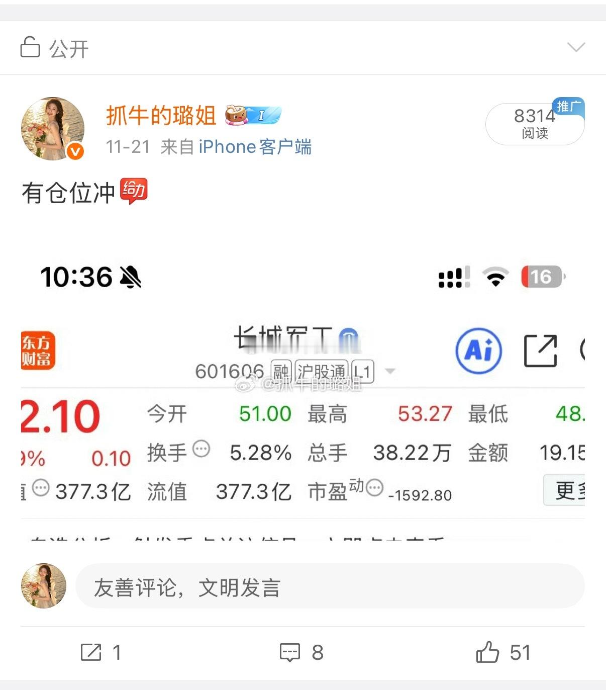 家人们!看了我微博的都知道$长城军工 sh601606$ 我上周五微博就公开分享出来给大家了,到今天还也还在分享,就是非常看好,结局也在璐姐意料之中,今天强势涨停了,恭喜进场的朋友吃大肉