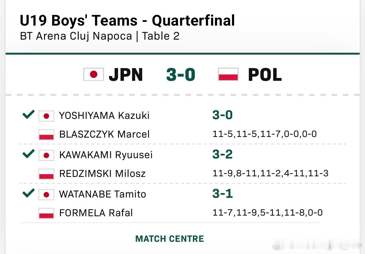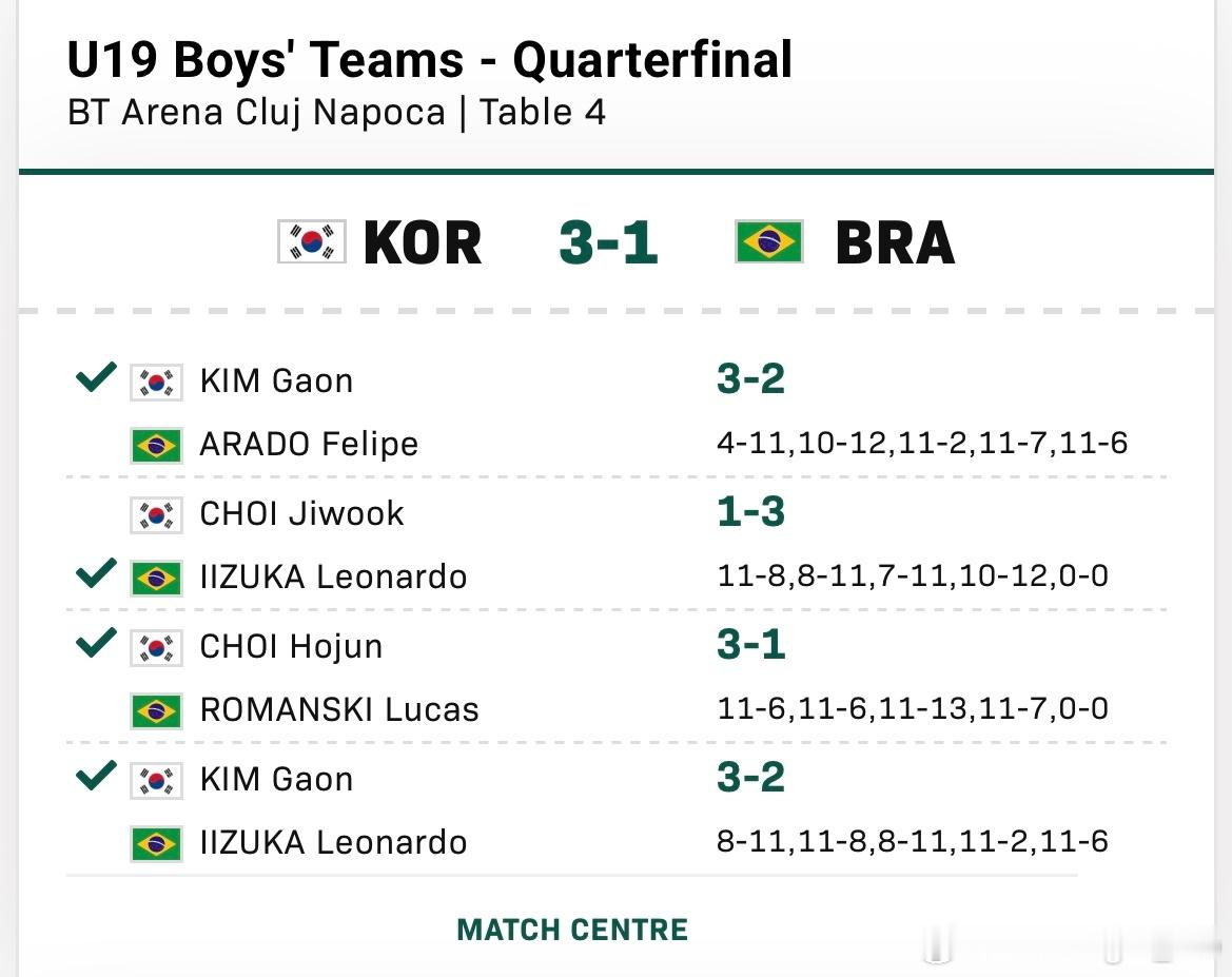 U19男团1/4决赛🇰🇷韩国3比1巴西🇧🇷金佳温3-2费利佩·多蒂·阿拉多崔志旭1-3莱昂纳多·饭冢崔浩俊3-1卢卡斯·罗曼斯基金佳温3-2莱昂纳多·饭冢🇯🇵日本3比0波兰🇵🇱吉山和希3-0马塞尔·布拉斯奇克川上流星3-2米洛什·雷德齐姆斯基渡部民人3-1拉法尔·福尔梅拉半决赛:🇰🇷韩国🆚日本🇯🇵