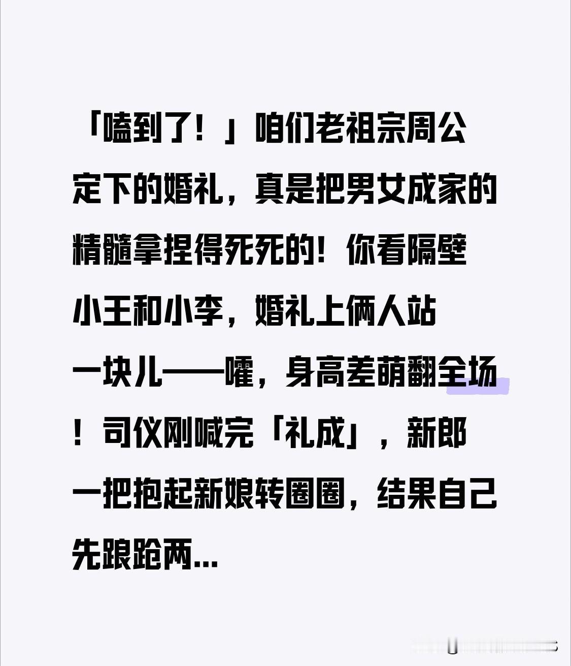 嗑到了! 咱们老祖宗周公定下的婚礼, 真是把男女成家的精髓拿捏得死死的!你看隔壁小王和小李, 婚礼上俩人站一块儿, 嚯, 身高差萌翻全场! 司仪刚喊完「礼成」, 新郎一把抱起新娘转圈圈, 结果自己先踉跄两步, 新娘笑得直捶他肩膀: 让你平时不健身! 全场亲友笑出眼泪。 这哪是婚礼啊, 根本是甜宠剧现场! 要我说, 老祖宗的智慧就在这儿: 夫妻嘛, 就是笑着闹着, 把日子过成糖。