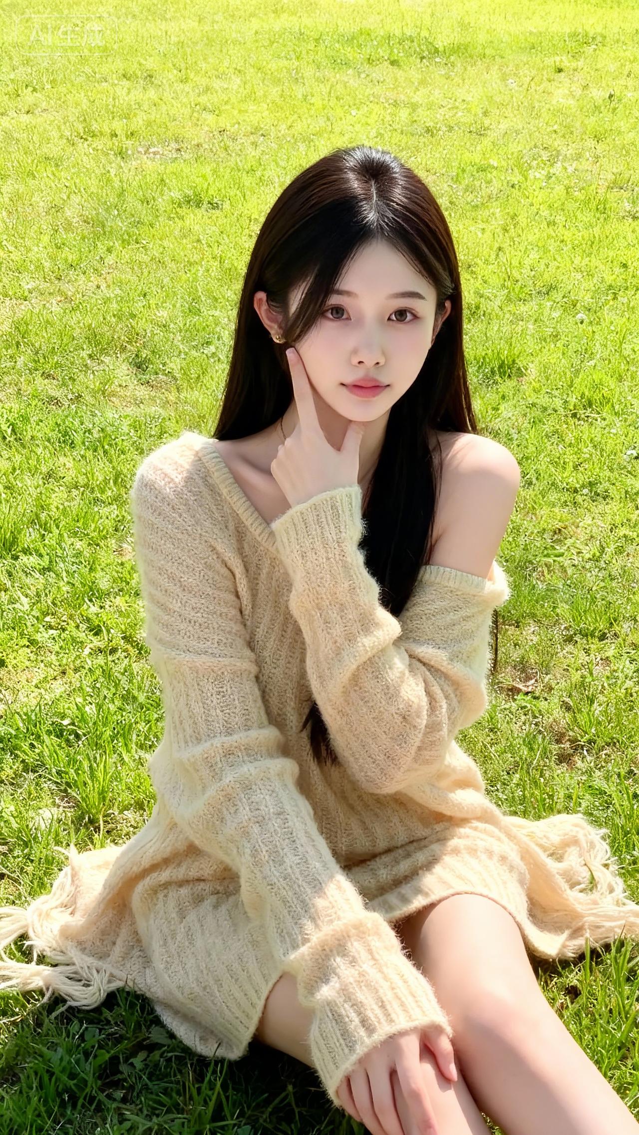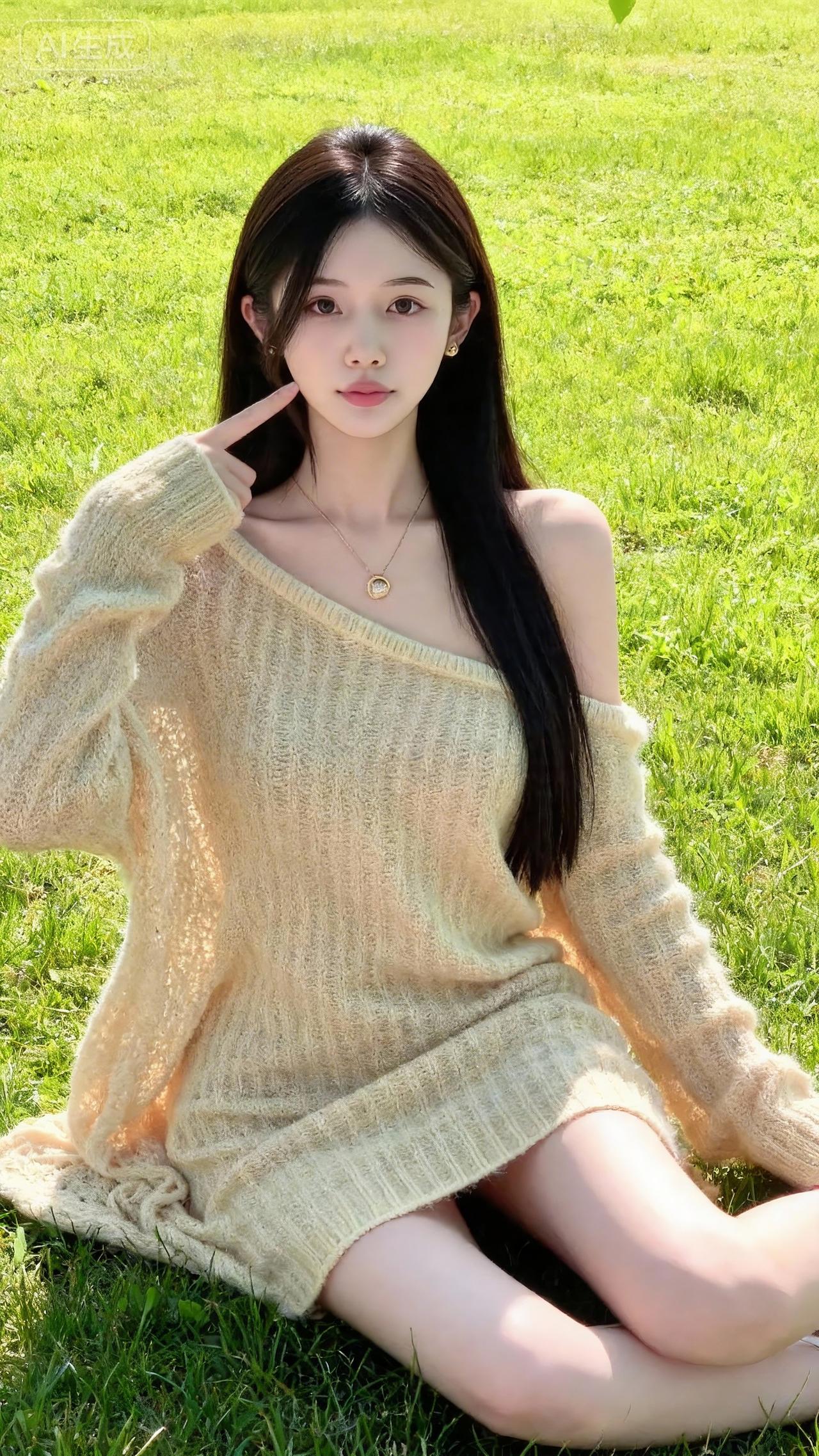 草坪甜妹,奶黄露肩针织裙,纯欲温柔氛围感绝了甜酷吊带裙绿野法式吊带裙气质减龄