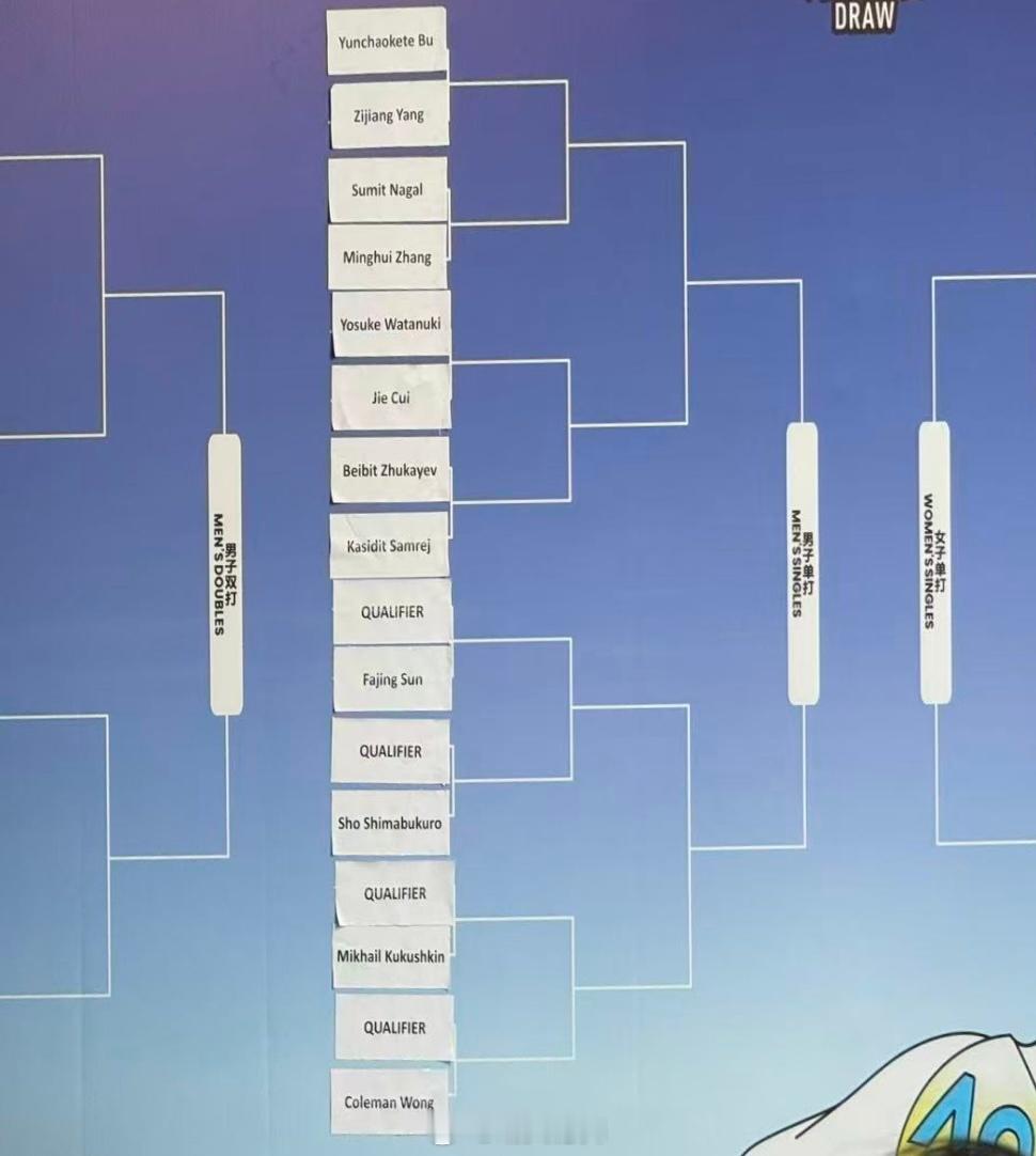 亚太区外卡赛男单正赛签表布云朝克特🇨🇳 vs 杨子江🇨🇳纳加尔🇮🇳 vs 张明辉🇨🇳绵贯阳介🇯🇵 vs 崔杰🇨🇳茹卡耶夫🇰🇿 vs 萨姆瑞🇹🇭Q vs 孙发京🇨🇳Q vs 岛袋将🇯🇵Q vs 库库什金🇰🇿Q vs 黄泽林🇭🇰