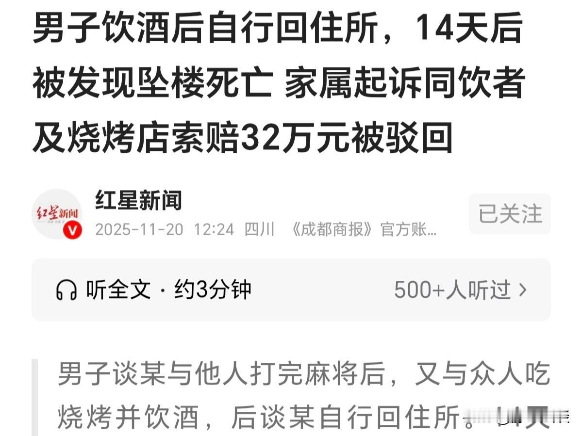 湖北大悟,男子打牌到深夜,散局后和牌友去喝酒撸串,6个人要了一瓶白酒,边吃边聊一直凌晨4点才结束,看着都没喝多,各自回家。没想到14天后,男子被邻居发现在小区坠楼身亡,家属悲痛之余因未获赔偿,将一同饮酒的5人及烧烤店夫妻俩告上法庭索要32万余元,可法院最终的判决,却完全超出了他们的预料。 严某珍开了个茶馆,街坊邻居没事都来捧场,谈某是这里的常客。 2024年11月3日,谈某和往常一样,吃完晚饭就来到茶馆,谈某刚到,付某、颜某波、颜某也先后赶到。 几个人围坐一桌,闲话少说,赶紧打牌,洗牌声、吆喝声此起彼伏,越打越有兴致,不知不觉就熬到了深夜。 喜欢打牌的人有瘾,来晚了看热闹的瘾更大,张某来晚了,没玩上看热闹也跟着熬到半夜。 散局的时候,几个人没有困意,反倒有点饿了,干脆出去吃点喝点乐呵乐呵。 按老规矩,严某珍收取提成后,又提取了200元一起吃夜宵。 谈某,付某、颜某波、颜某、连同看热闹的赵某元,还有开茶馆的颜某珍,6个人说说笑笑去吃饭。 大半夜也只有烧烤店还开门,想着喝点小酒、撸点串,也不错。 到了烧烤店,老板夫妻俩忙着招呼,炭火上架起肉串,滋滋冒油,香气很快飘了出来。 几人找了张桌子坐下,点了一桌子烤串,又合计着来点白酒助兴,6个人最终只点了一瓶白酒,倒在杯子里分着喝。 一边慢慢吃着烤串,一边闲聊着白天的琐事、打牌时的输赢,话题没断过,氛围也格外轻松。 没人劝酒,也没人拼酒,谁渴了就抿两口,饿了就多吃点,酒喝得慢悠悠,饭也吃得自在。 一直坐到凌晨四点多,桌上的烤串见了底,那瓶白酒也刚好喝完。 几人各自摸了摸肚子,时间也不早了,吃饱喝好就都回家休息,看着都很清醒。 严某珍去结的帐,一共消费210元,大家还开玩笑他倒搭。 临走的时候,几人还互相叮嘱了两句“路上慢点走”“到家歇着吧”,随后便各自回家。 谈某也脚步平稳地回了自己小区,没人想到,这竟是最后一别。 日子一天天过,没人再刻意惦记那晚的酒局,大家该打牌打牌、该做生意做生意,一切都跟往常一样平淡。 可谁也没料到,14天之后,一则噩耗突然打破了这份平静。 2024年11月17日,有邻居发现,谈某在小区5楼和6楼之间的平台上,早已没了生命体征。 谈某的家属得知消息后,更是瞬间崩溃,赶紧报了警,好好的一个人,怎么突然就坠亡了? 消息传到之前一起喝酒的几人耳朵里,大家都吓了一跳,满心都是意外和惋惜。 前些天还在一起打牌喝酒,真是世事难料,可惜好好的人说走就走了。 谈某的家属疑惑,谈某出事前14天,和他一起喝酒的5个牌友和茶馆老板,会不会跟那晚的酒局有关系? 家属看着亲人离世却没人愿意负责,心里又痛又气,最终一纸诉状把付某、颜某波等5名同饮者,还有烧烤店老板夫妻俩一起告上了法院。 要求7人共同承担赔偿责任,合计索赔32万余元,给逝去的亲人一个交代。 付某,严某等5人不认同,14天前确实和谈某打牌喝酒,但6个人喝了一瓶白酒,根本不过量。 再说都过去两周了,也不知道谈某具体死亡原因和时间,就让我们负责,这到哪都说不通。 烧烤饭老板更委屈,来的都是客,喝不喝酒我说的不算,这和我有什么关系。 那么,从法律的角度,该如何认定这件事呢? 《民法典》第1165条第一款 :行为人因过错侵害他人民事权益造成损害的,应当承担侵权责任。 谈某6人分饮一瓶白酒,且无劝酒拼酒行为,谈某离场时神志清醒、脚步平稳,同饮者还叮嘱其路上慢点,已尽到基本注意义务。 烧烤店老板仅提供正常餐饮服务,无诱导饮酒等过错行为。 更关键的是,谈某坠亡发生在酒局14天后,家属无证据证明其坠亡与14天前的饮酒存在直接因果关系。 《民法典》第1173条 :被侵权人对同一损害的发生或者扩大有过错的,可以减轻侵权人的责任。若损害完全因被侵权人自身过错导致,侵权人可免除责任。 谈某作为完全民事行为能力人,对自身生命安全负有最高注意义务。 酒局后其正常回家,14天内的生活状态、坠亡具体原因均与同饮者及烧烤店无关,无证据表明他人行为对其坠亡存在影响。 法院审理认定,谈某家属无法提供有效证据,应承担举证不足的后果,法院依法不予支持。驳回谈某家属的诉讼请求。 谈某深夜和朋友打牌喝酒后14天坠亡,家属索赔32万被拒,法院判决合情合理。 同饮者6人只喝一瓶酒,无劝酒行为,散场时还叮嘱安全,已尽到应尽义务,没有过错。 烧烤店只是正常经营,也无责任。关键是坠亡和14天前饮酒无直接因果关系,时间跨度太长,无法牵强绑定。 成年人要对自己的生命安全负责,家属悲痛可以理解,但遇事需理性看待,不能违背法理盲目追责。 对于谈某家属的诉求,你觉得合理吗? @静心法谈 学法辨是非,慬法不吃亏。