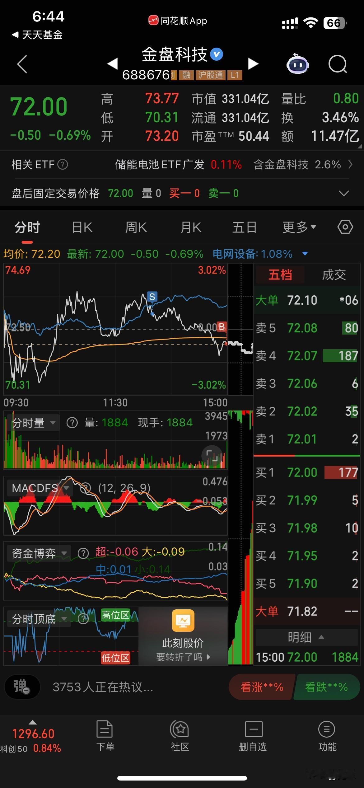 今天一大早开车去上海,所以上午没有时间看盘,中午打开手机发现华友重挫5个点[发怒],下午终于有时间盯盘,对金盘做了个T。今天继续亏近500,这月还有点微利[捂脸]。今日大盘缩量小幅反弹,担心明天大盘延续调整之势。下午趁华友反弹清空了,虽然看好华友未来行情,当下在大盘向下趋势未反转的情况下,还是要控制仓位。目前2成仓不到,持有金盘和盈峰。