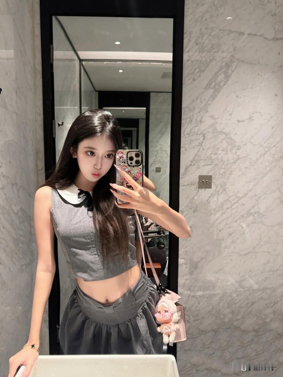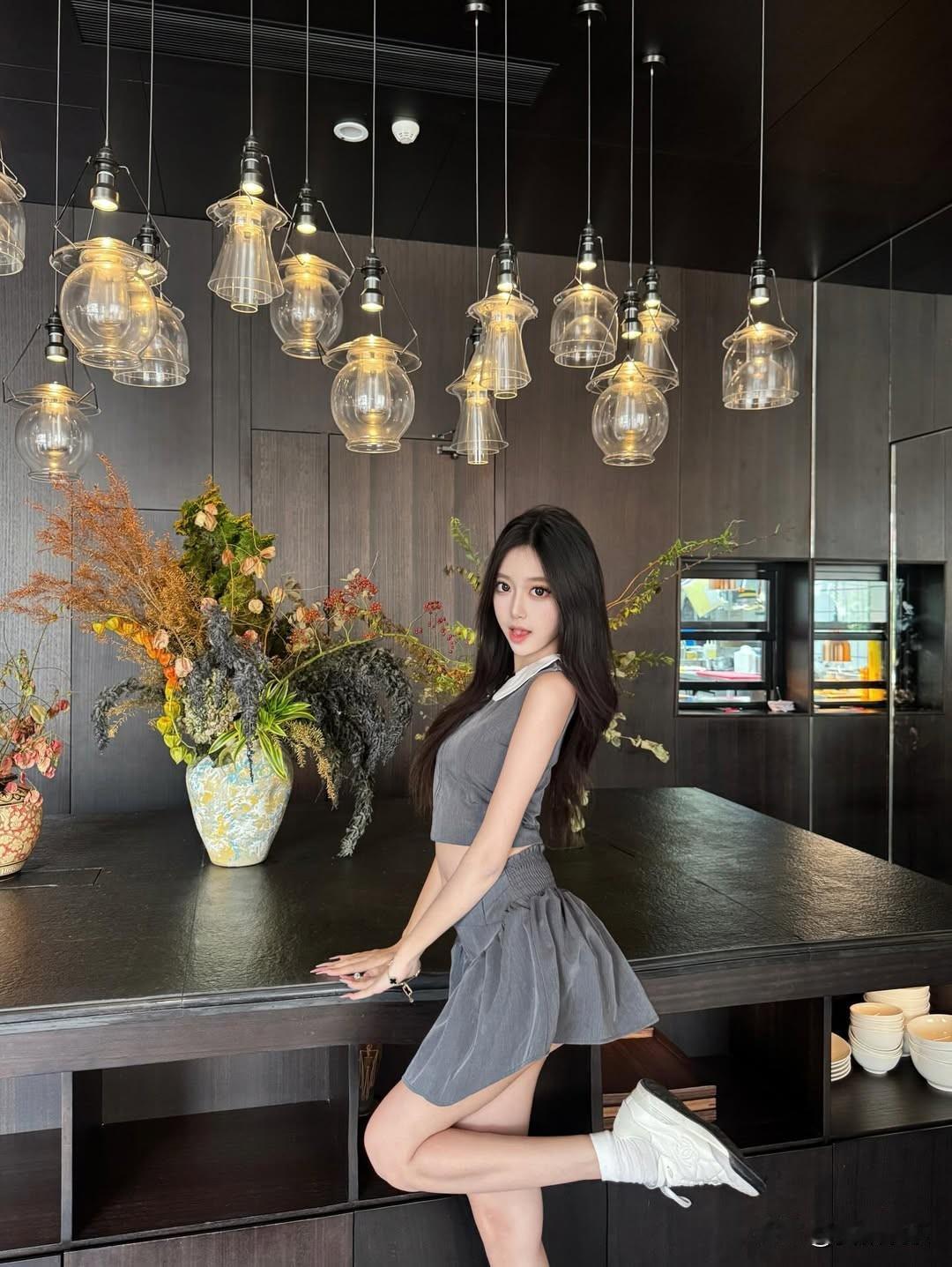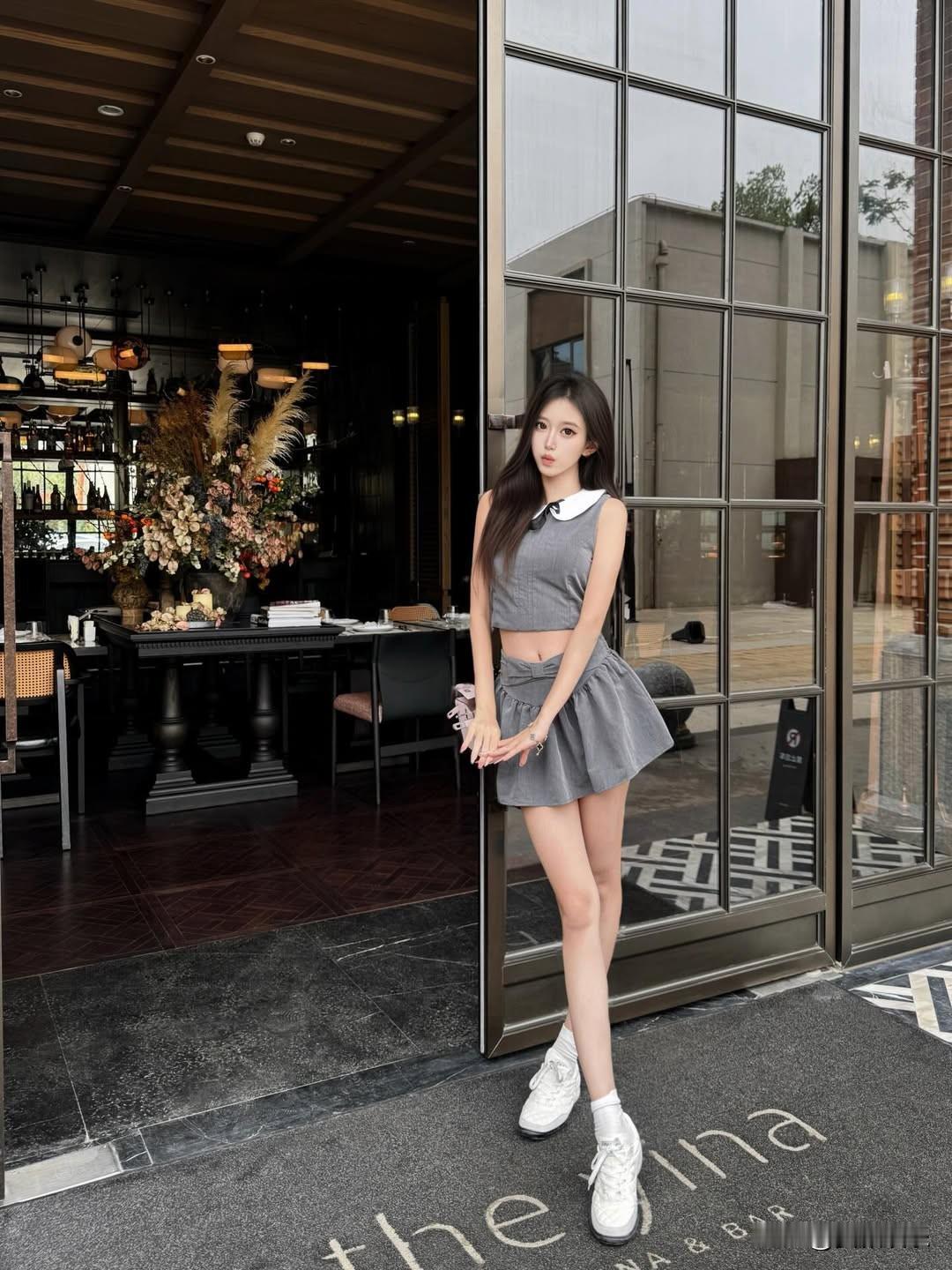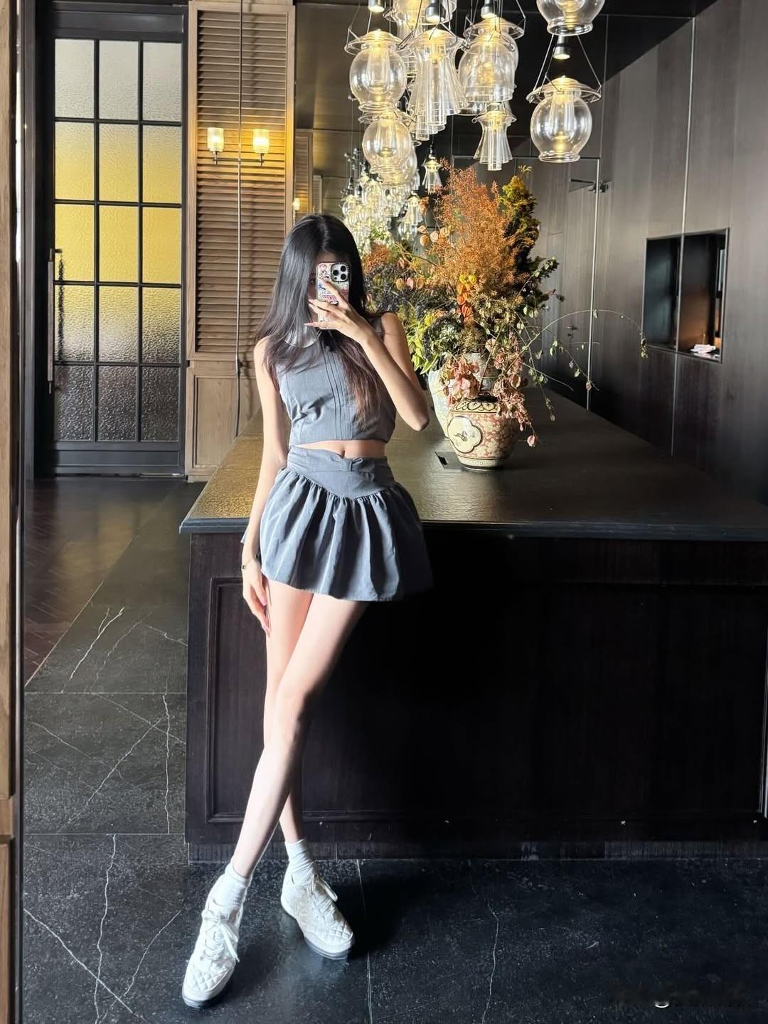 灰色系短上衣搭配黑色百褶裙,清新又时尚!👗💕