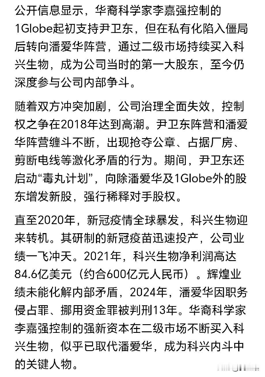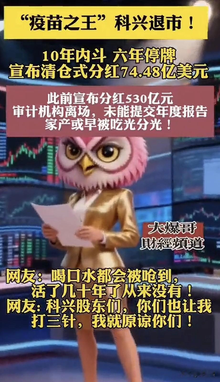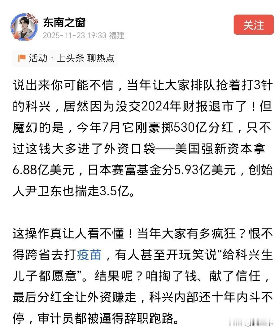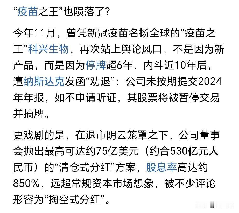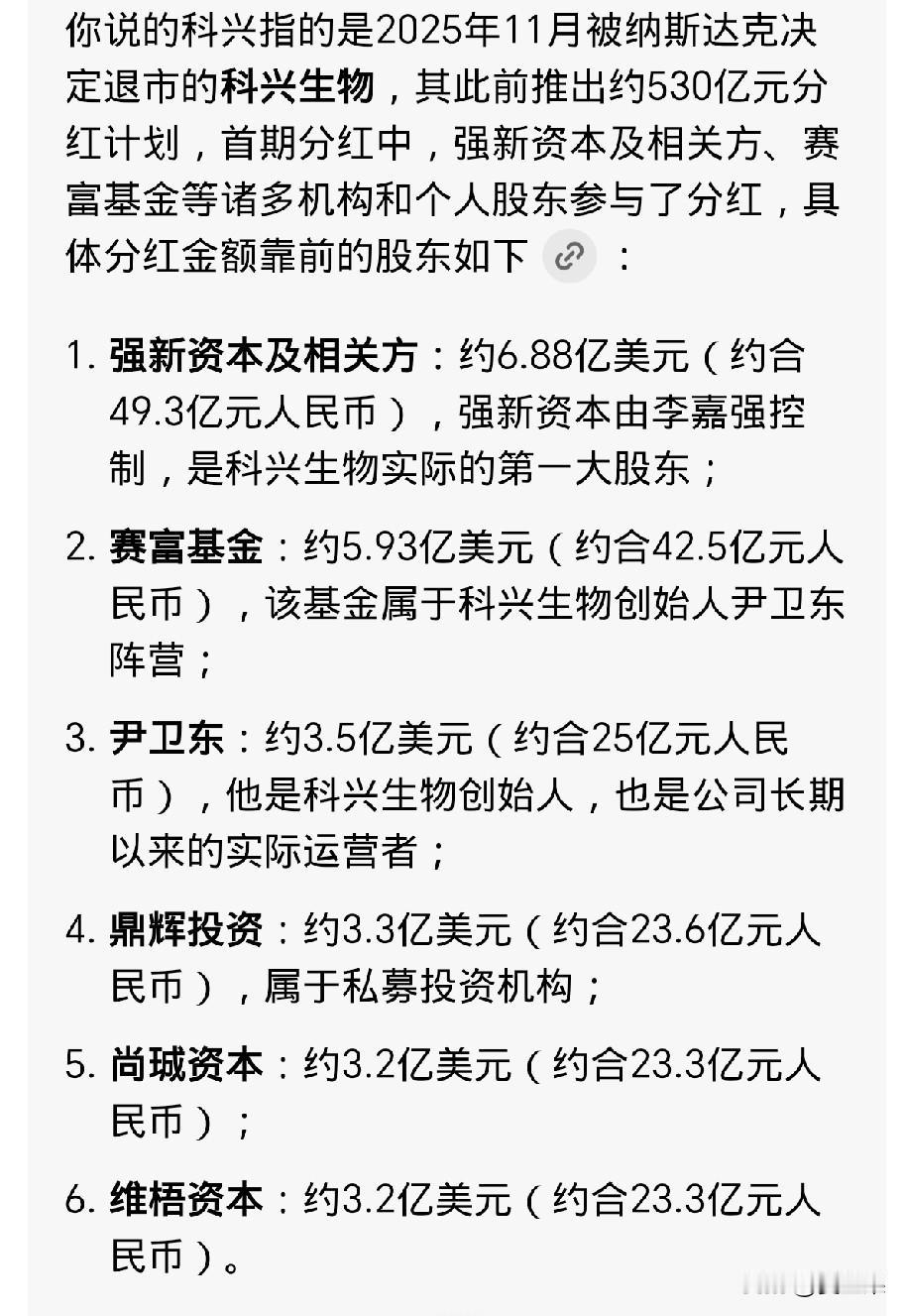 咱们打的科兴疫苗公司竟然退市了! 怎么可能呢? 新冠疫情期间,它挣了那么多钱。 可事实就是这样, 它是在美国纳斯达克上市的,本来按照规定,它今年要交2024年财务报告, 可是一直交不上,所以强行被退市了。 退市的原因跟它内部长期的权力派系争斗有关系。 它一边退市,一边进行清算分红,大概给股东们分了530亿人民币,合计75亿美元。 它的股东和分到的首次股红分别是: 强新资本6.88亿美元(外资)、 尹卫东3.5亿美元、 赛富基金5.93亿美元(外资)、 鼎辉投资3.3亿美元(外资)、 尚珹资本3.2亿美元(外资)、 维梧资本3.2亿美元(外资)。 有人说,这个退市分红,就是奔着就此作别、各自散伙的目的分的,因为家底都掏空了。 有人还说,科兴生物就是下一个许家印。