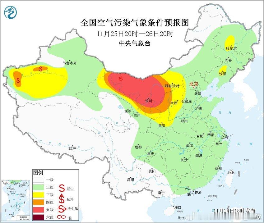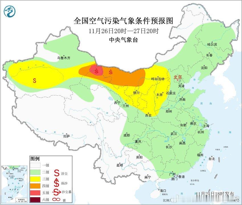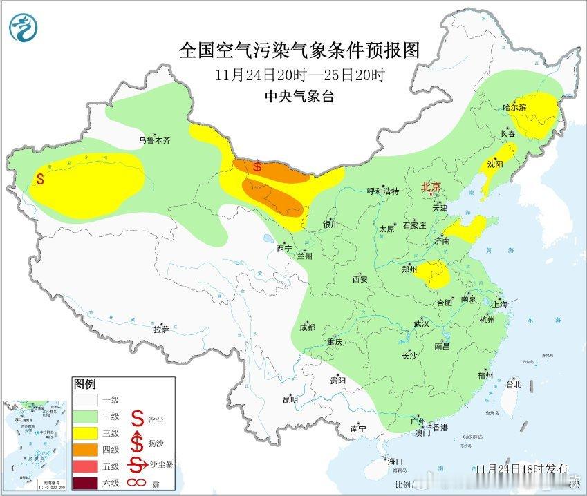 【沙尘】今天中午-下午,源自西北上游的沙尘,逐渐东移,山西、河北空气质量陆续转好,河南、山东部分地区受到影响,PM10超标。另外辽宁一带因为大风,也出现了沙尘污染,17时鞍山、营口空气质量爆表。今晚到明天,辽宁的沙尘也可能向南波及到山东半岛。这股冷空气的沙尘影响后天结束。但是未来3天,新一股冷空气又会引发沙尘天气。预计25日至27日,西北地区东部、华北西部、黄淮西部等地的部分地区有扬沙或浮尘天气,其中,内蒙古西部、宁夏北部等地的部分地区有沙尘暴。