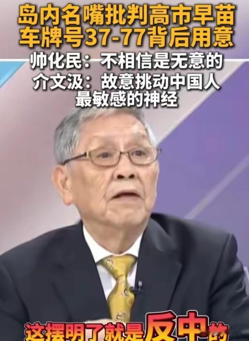 高市早苗肯定知道车牌号37—77背后用意,37年7月7日,卢沟桥事变,看来,她们还是贼心不死啊。 帅化民:这个车牌号码,我不相信是无意的,这摆明了吗? 介文汲:那我也不认为,高市早苗完全不知道,这4个号码代表的意义,因为她是一个政治人物,还是一个极右翼;即使说她自己不知道,我想人家看到她车牌,有人会去提醒她的,你去触碰了一条最敏感的神经。 连我们普通人都知道,她会不知道?怎么可能呢?就是挑衅 加大力度吧,光暂停日本水产品根本不够;要让她们知道我们不是可以随便招惹的。