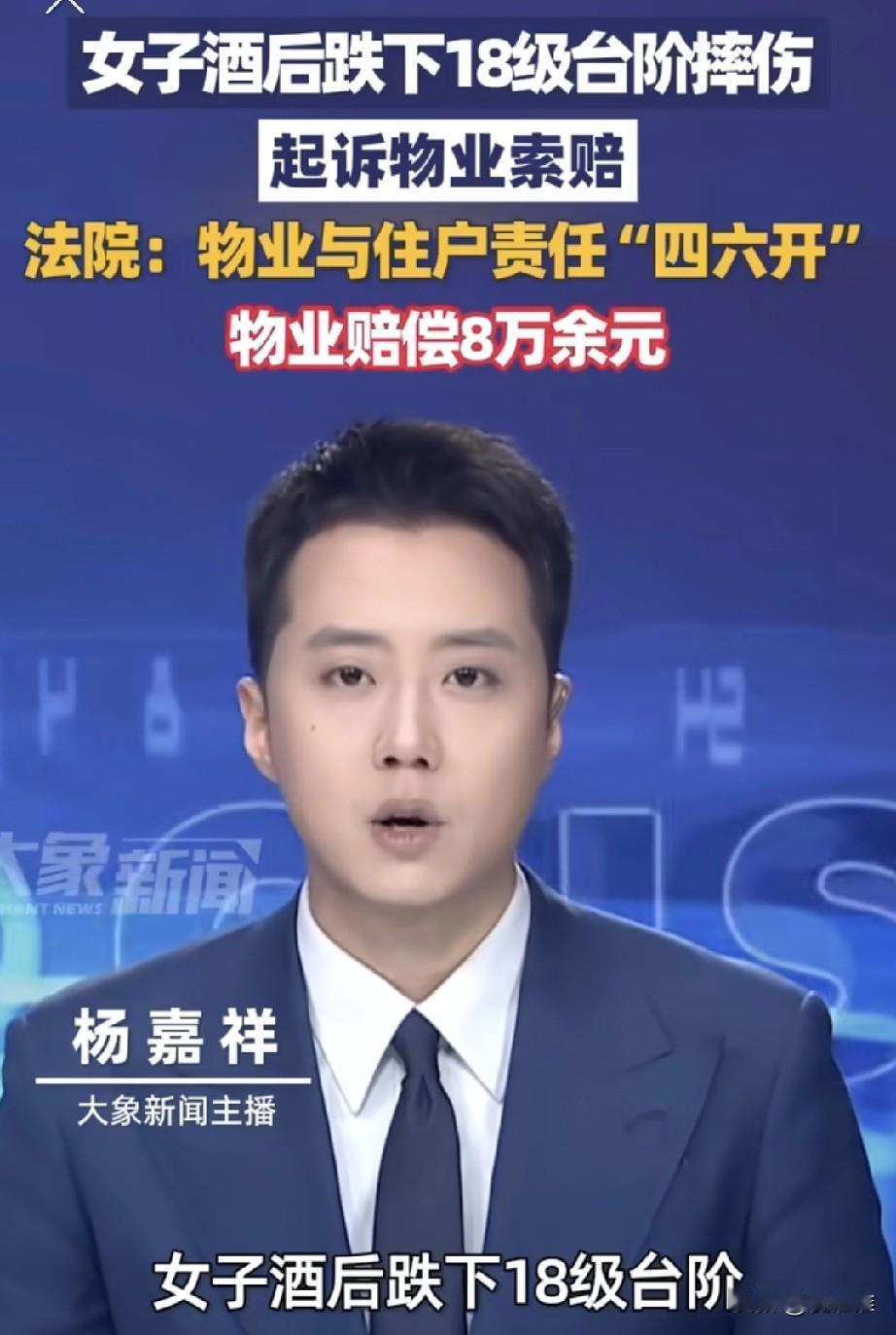 物业也挺冤的。女子酒后下楼扔垃圾,想抄近道,便从消防通道门走了过去,没想到由于通道内没有灯,再加上自己喝了酒走路不稳,从楼梯上摔了下来,造成骨折。 出院后女子觉得物业应该对自己的受伤负有一定的责任,于是把物业告上法庭,索赔26万元,法庭上,物业称开发商交房时消防通道就没有装灯,并不是自己后期拆除的。法院审理后认为,女子作为成年人酒后走消防通道,对安全的认识不够,承担60%的责任,而物业因为疏于管理,承担40%的责任,赔偿女子8万元! 我觉得:消防通道是应急通道,并非常用的正常通道,女子自己酒后失态,大路不走走暗道,最后摔伤,还要起诉物业,真是害己又害人。