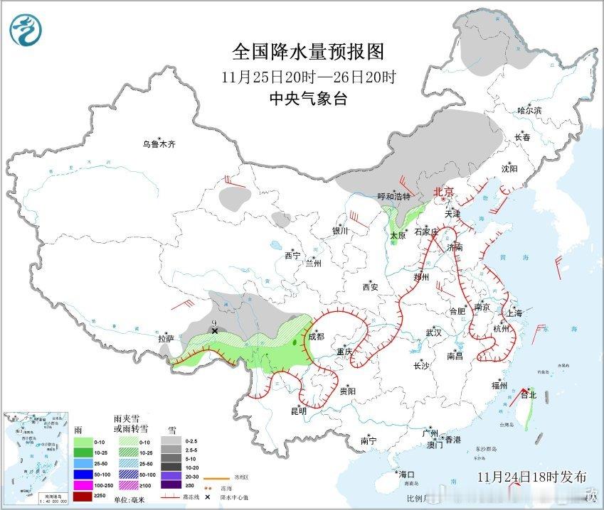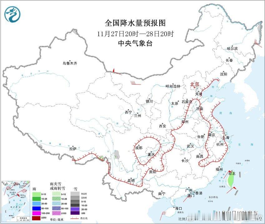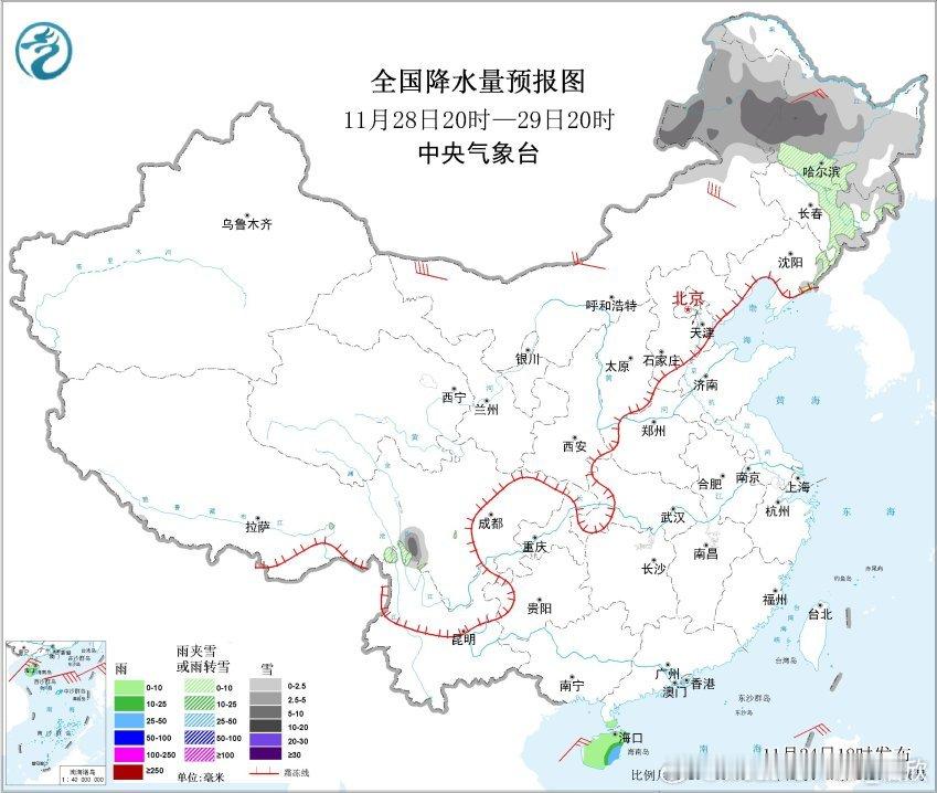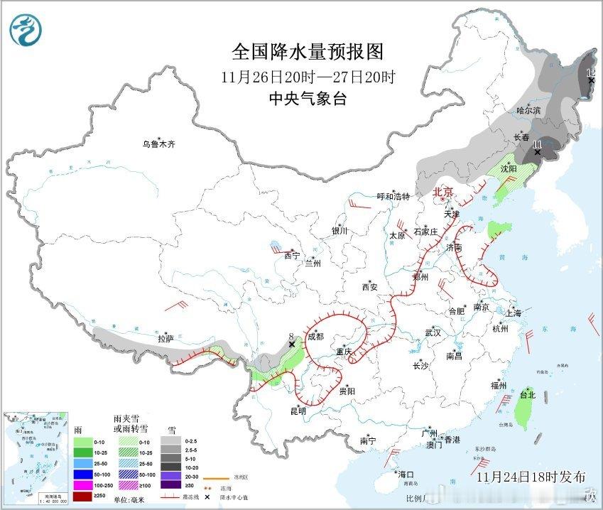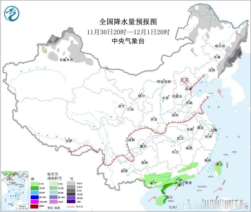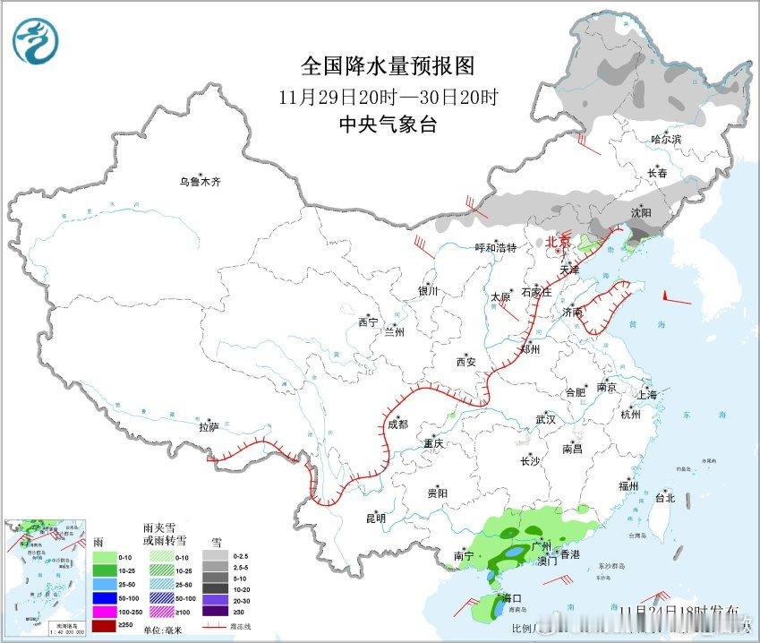 【降水】昨晚到今天,甘肃、内蒙古等地出现降雪。这轮冷空气导致的降雪,今晚到明天在东北收尾。同时,明天新一股冷空气带来,新疆北部又将出现降雪。这股冷空气未来也会东移,26日内蒙古中东部、27日东北一带也会有降雪,其中27日黑龙江东部和吉林东部可能有大雪-暴雪。28日降水很少,不过29-30日因为又一股冷空气到来,内蒙古和东北地区还有降雪。这个降雪的强度,近期数值预报并不稳定,要根据后期临近高空槽和地面气旋发展情况来修订。此外,11月30日-12月1日华南有可能出现一些降雨。这个是因为低空冷空气南下和副热带高压北侧暖湿气流交汇导致。