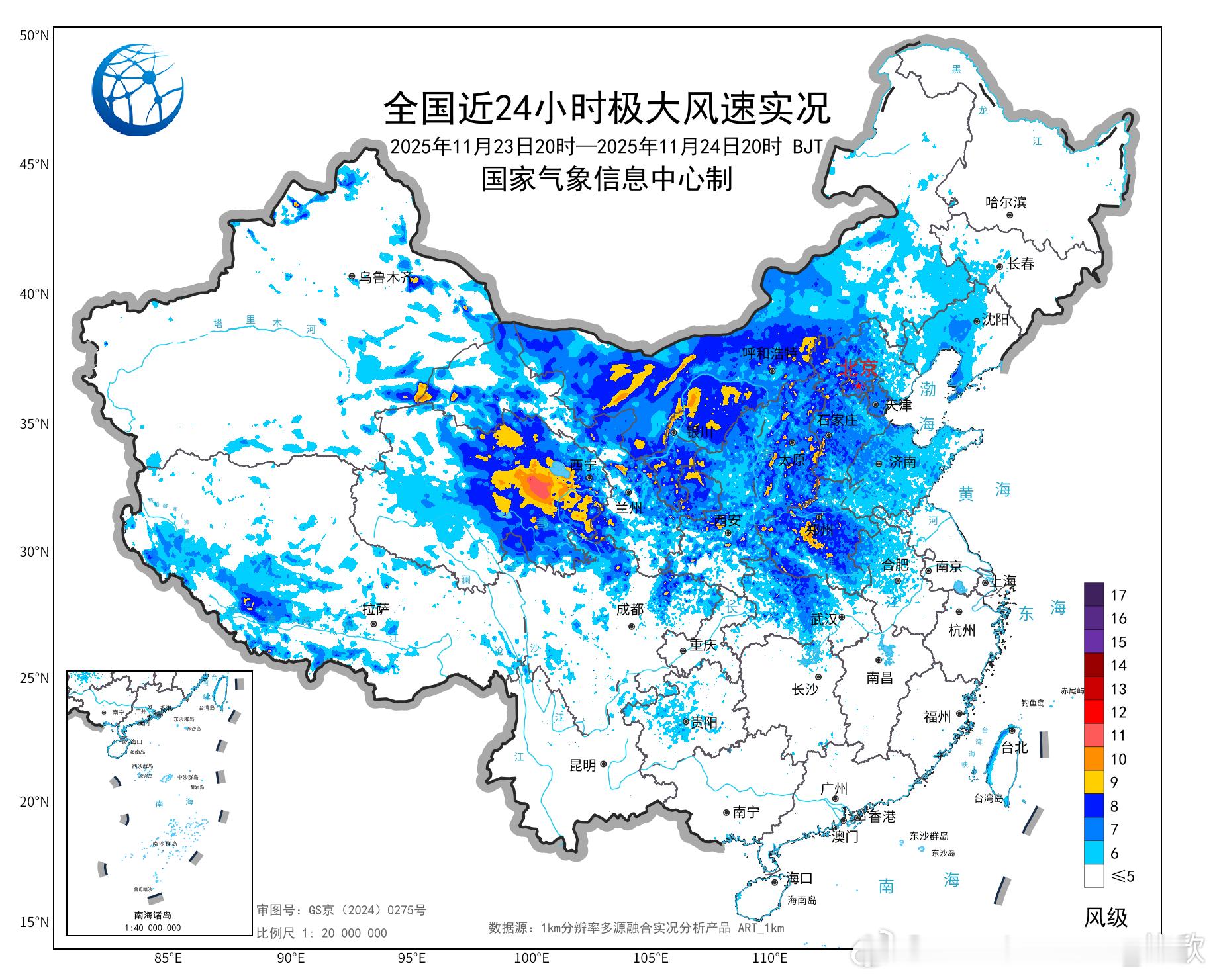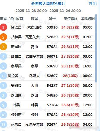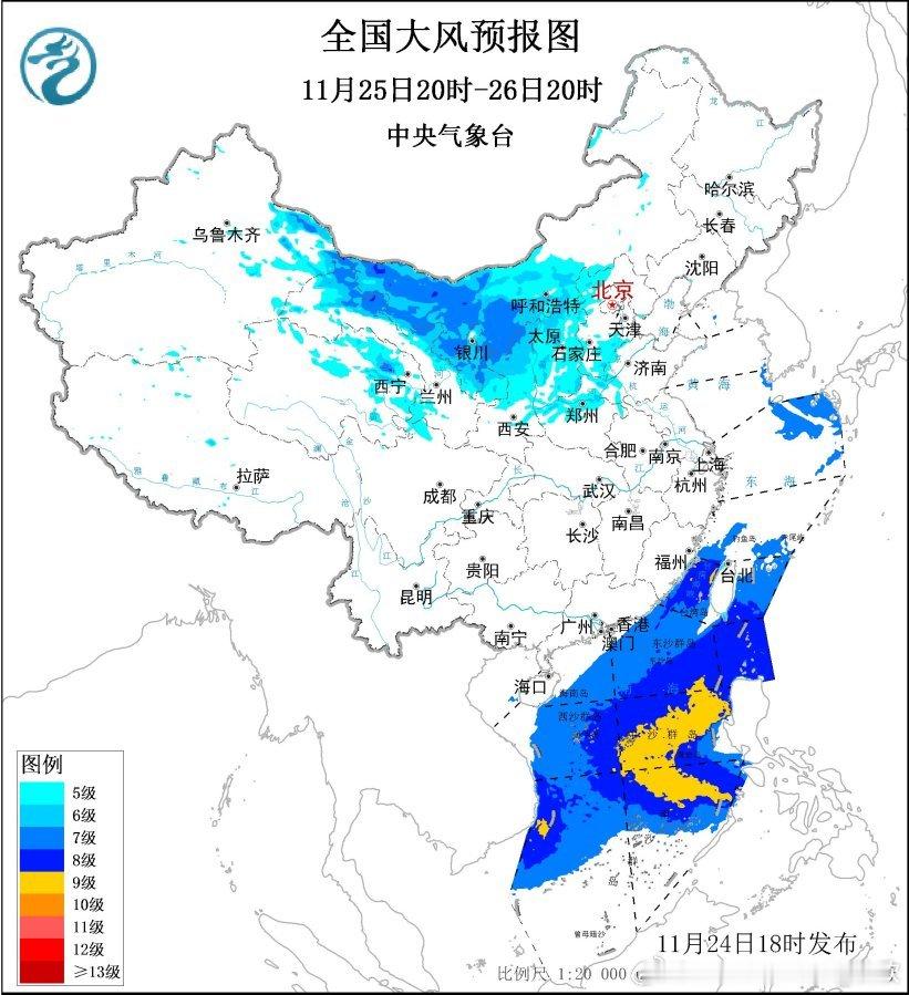 【大风】昨晚到今天,我国北方多地出现大风天气,宁夏六盘山在今天04-05时阵风达到了12级(34.3米/秒),为当地11月并列第二强的阵风。此外青海瓦里关、吉林长白山天池、河南嵩山,出现了11级阵风。未来因为冷空气活跃,大风天气还会频繁出现。而且未来南海上可能还有台风活动,也会导致大风。预计,11月24日20时至25日20时,新疆东部、内蒙古中西部、华北、黄淮、江汉、江淮、江南北部、西藏北部等地部分地区有5~6级、阵风7~9级的大风;渤海、渤海海峡、黄海大部海域、东海大部海域、台湾海峡、台湾以东洋面、巴士海峡、南海大部海域、北部湾将有7~8级、阵风9~10级的大风。11月25日20时至26日20时,新疆东部、内蒙古中西部、青海北部、甘肃河西、宁夏、华北西部、黄淮西部等地部分地区有5~7级、阵风8~10级的大风;台湾海峡、台湾以东洋面、巴士海峡、南海大部海域将有7~8级、阵风9~10级的大风,其中台湾海峡、南海东部和西南部的部分海域风力可达9级,阵风10~11级。