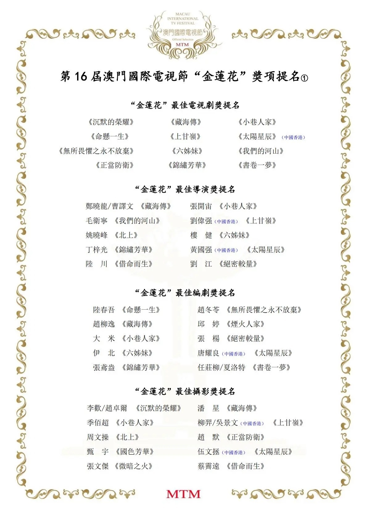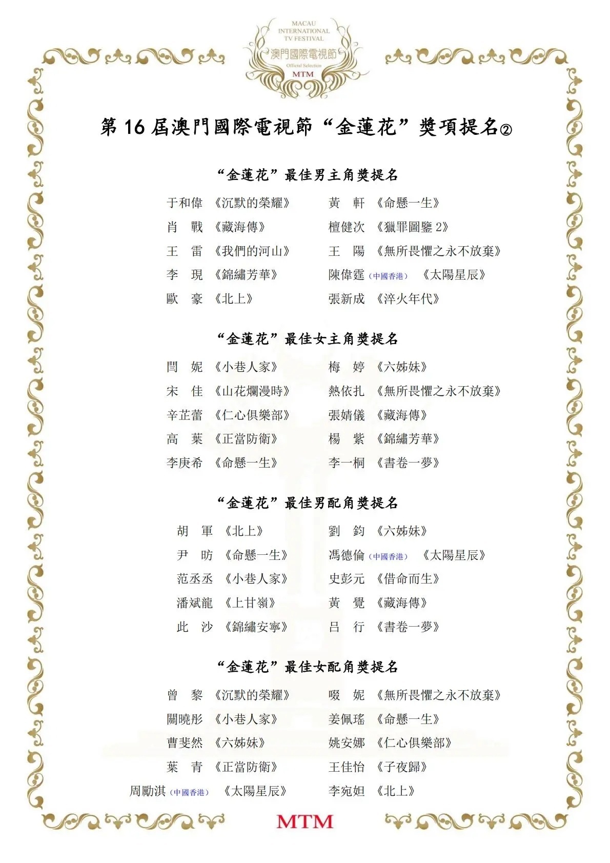 恭喜《太阳星辰》在第16届澳门国际电视节“金莲花”奖获得7项提名,陈伟霆获得最佳男主角提名!!杨sir值得陈伟霆饰演的杨光耀〔耀Sir〕穿越时空追寻真凶,寻找亲人,双时代的故事背景,与不同年龄段饰演耀Sir女儿的演员演对手戏,把父亲这个角色演得毫无违和感!父女情、夫妻情、兄弟情,以及作为一名正义警察的使命感,被他演绎得淋漓尽致!此外,陈伟霆还获得了第30届亚洲电视大奖最佳男主角提名 。