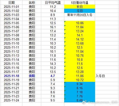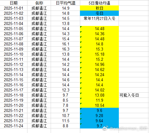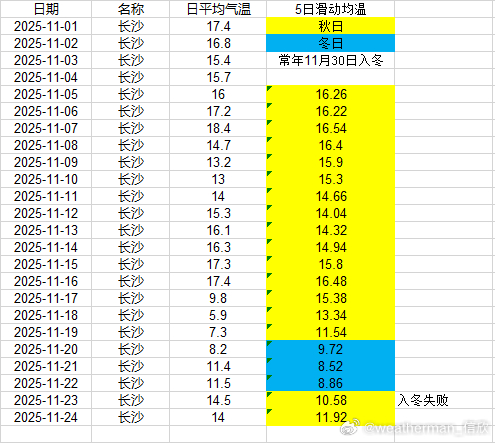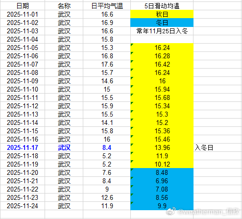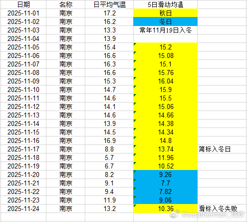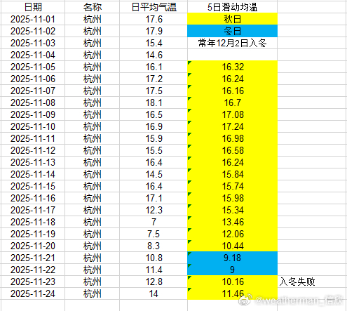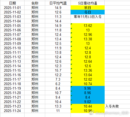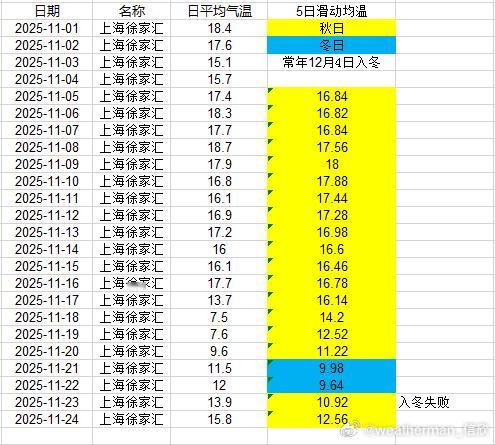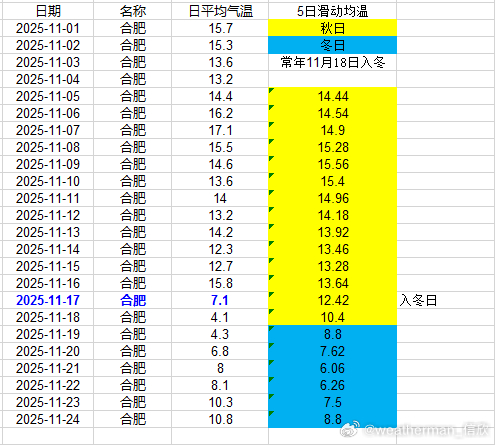【入冬进展】目前入冬情况阶段性结果出炉,合肥11月17日、武汉11月17日、贵阳11月18日入冬,均略提前。南京今天是判定日,但因为升温导致入冬失败。郑州、上海徐家汇、杭州、长沙也因为近期升温,导致入冬失败。成都温江站,明天是判定日,能否入冬,等最后数据出来。