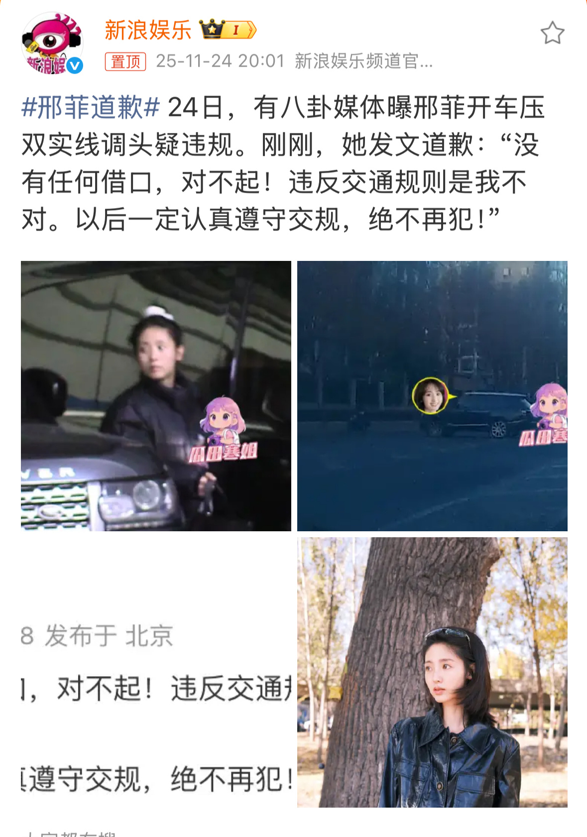 邢菲压双实线调头违规,40分钟火速认错不辩解,态度诚恳值得肯定,这份直面问题的担当比找借口更显清醒。不过双实线是安全红线,三条车道违规调头确有风险,公众人物更该以身作则守交规。认错是第一步,后续更需用实际行动践行承诺。安全驾驶才是根本,也给所有人提了醒。