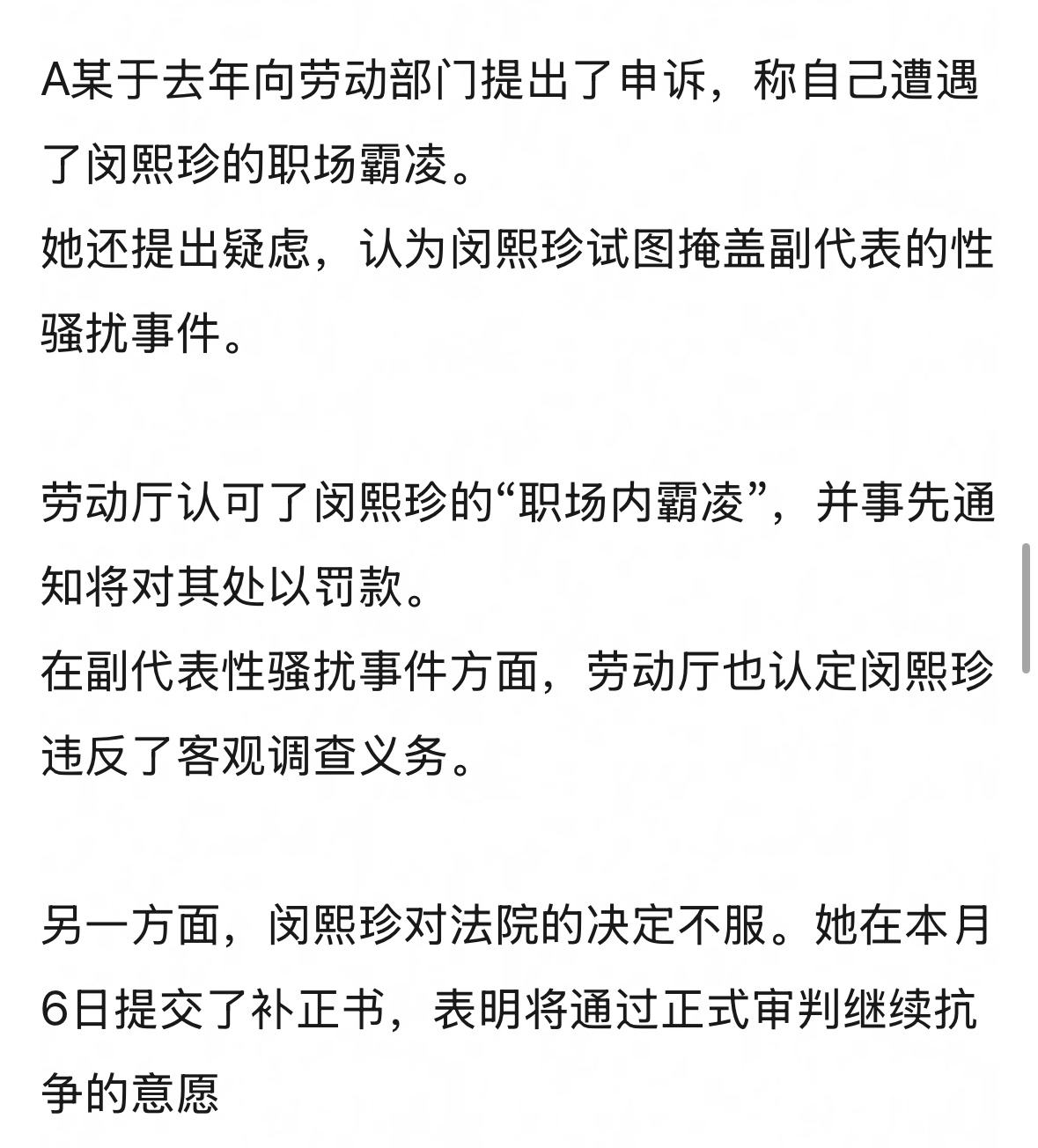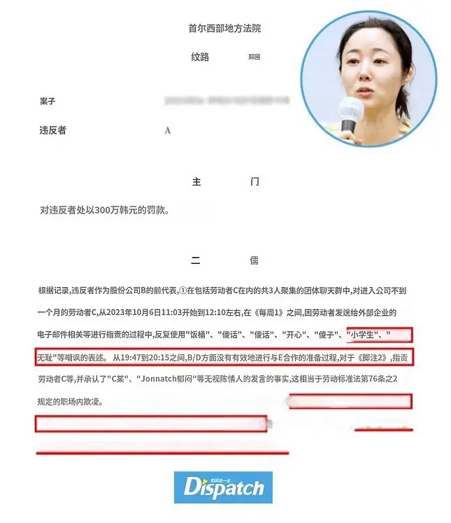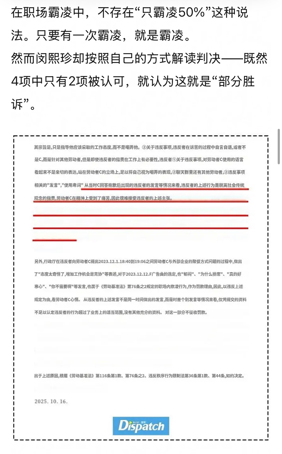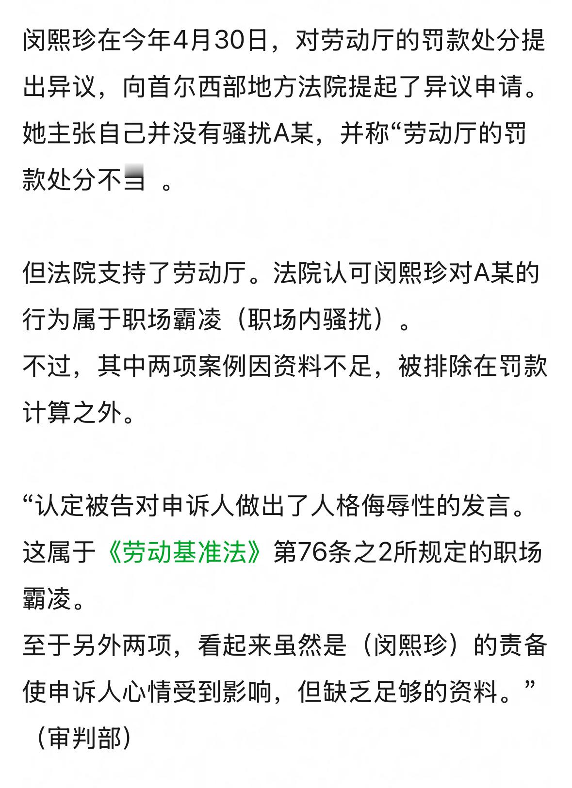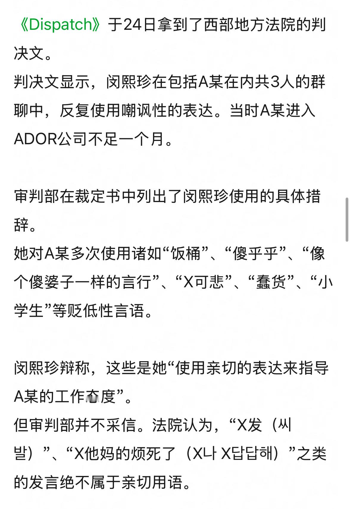 D社公开了闵熙珍职场霸凌的判决书判决文显示,闵熙珍在包括A某在内共3人的群聊中,反复使用嘲讽性的表达审判部在裁定书中列出了闵熙珍使用的具体措辞:她对A某多次使用诸如“饭桶”、“傻乎乎”、“像个傻婆子一样的言行”、“X可悲”、“蠢货”、“小学生”等贬低性言语。闵熙珍辩称,这些是她“使用亲切的表达来指导A某的工作态度”但法院认为,以上发言并不属于亲切用语。