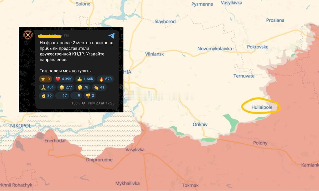 11月24日,俄罗斯战地记者报道,经过两个月的训练后,朝鲜部队被转移到扎波罗热州中部的胡里艾波尔(Huliaipole)11月14日,俄罗斯总统新闻秘书佩斯科夫表示,俄罗斯将永远铭记朝鲜军队在库尔斯克州排雷任务中发挥的关键作用,俄罗斯对朝鲜的“无私英雄主义援助”深表感激。 韩国国防部消息,目前已有超过10000名朝鲜士兵进入俄罗斯,其中相当一部分被派往库尔斯克前线。自2022年2月俄乌冲突以来,朝鲜已向俄方提供约650万枚炮弹,以换取俄罗斯的军事技术,用于武器制造。朝鲜已从俄罗斯获得防空系统、太空开发相关技术,以及价值约200亿美元的援助。