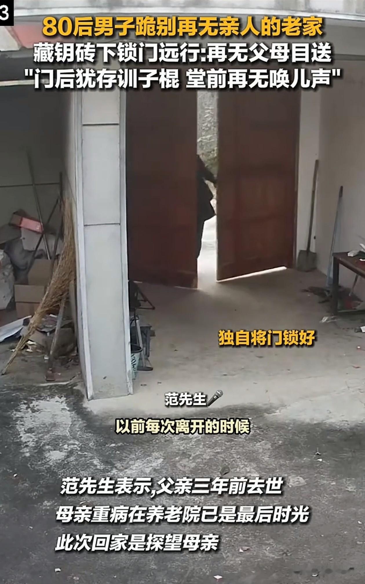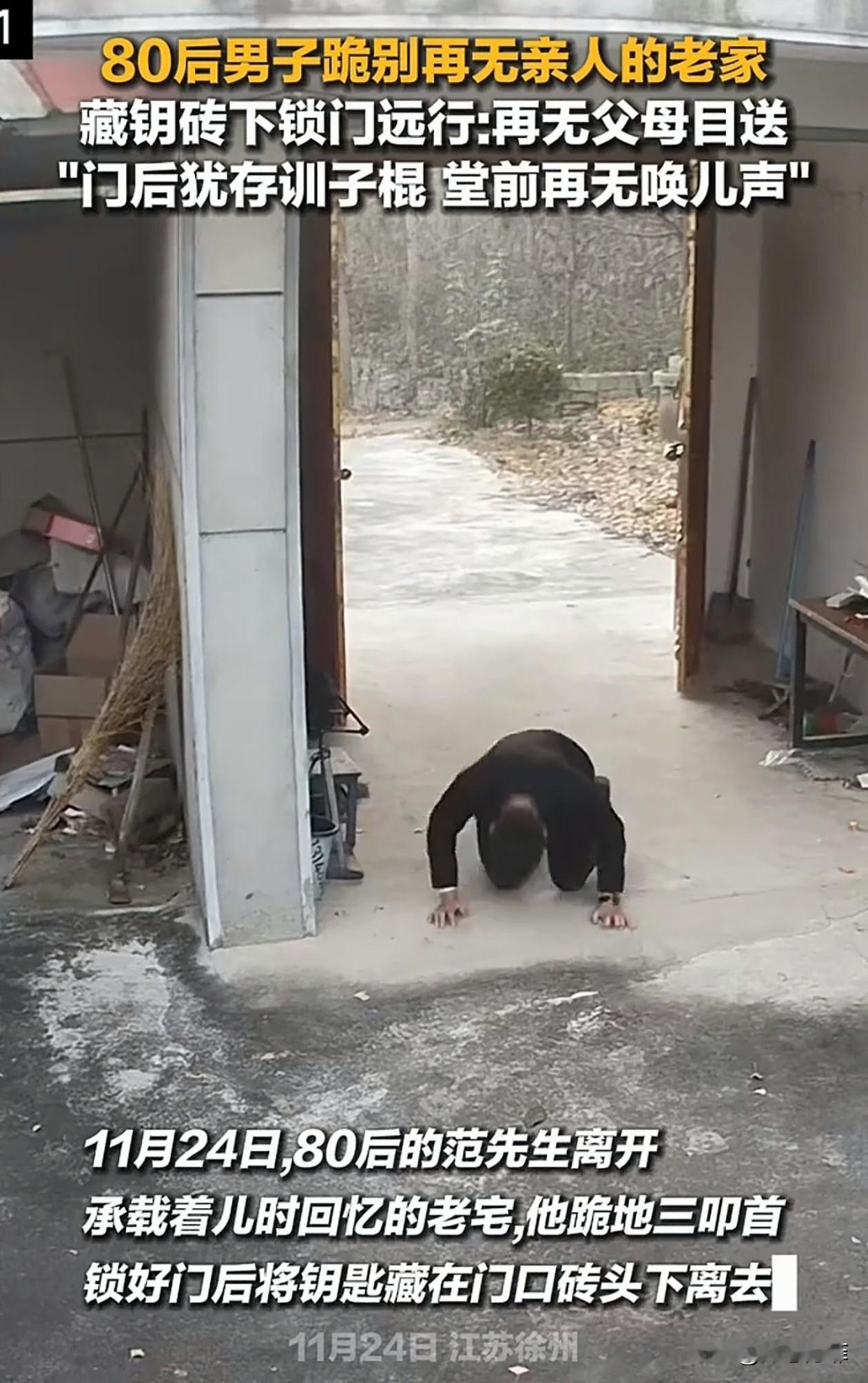 泪目了!江苏,一80后男子离开老家时,满是不舍,直接跪地三叩首,以前他都有父母的目送,这次却只能自己锁门。网友:漂泊的我们,有空一定多回家看看。 男子的父亲已经离世了,母亲因为病重在养老机构接受照料,老家的老宅从此再无亲人了。 他这次回乡,是处理老宅的一些琐事,处理完,就准备彻底告别这座装满童年回忆的房子。 临走时,他站在老宅门口,看着斑驳的墙壁和院子里没人打理的杂草,想起以前和爸妈在一起的日子,再也忍不住红了眼眶。 他慢慢跪下,对着老宅磕了三个头,然后独自锁好门,才依依不舍地离去。 他说,以前回家还有妈在,现在老宅空了,再没亲人等我了。每一次离开都像跟过去的自己告别,也越发觉得,趁父母还在,一定要多回家看看。 男子这一跪,跪的是乡愁,也是再也回不去的童年,让人感动又心疼。 房子再大再好,没人等你,就不是真正的家了,爸妈的时间不等人,有空就多陪陪他们。 希望所有在外打拼的人,都能常回家看看,珍惜现在,不留遗憾。