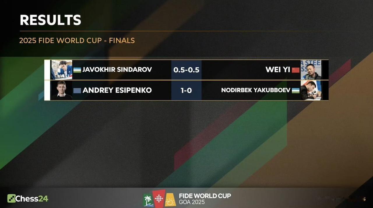 世界杯决赛第一局,韦弈战平辛达洛夫! 11月24日,2025国际棋联世界杯赛决赛两局慢棋之第一局,辛达罗夫执白经过50回合较量战平韦奕;铜牌之战,艾斯蓬科执白战胜雅库鲍耶夫。 今天进行第二局慢棋的较量,韦弈获胜就将夺得本届世界杯冠军,埃斯彭科战平就将夺得第三名,获得一张世界冠军候选人赛参赛资格。