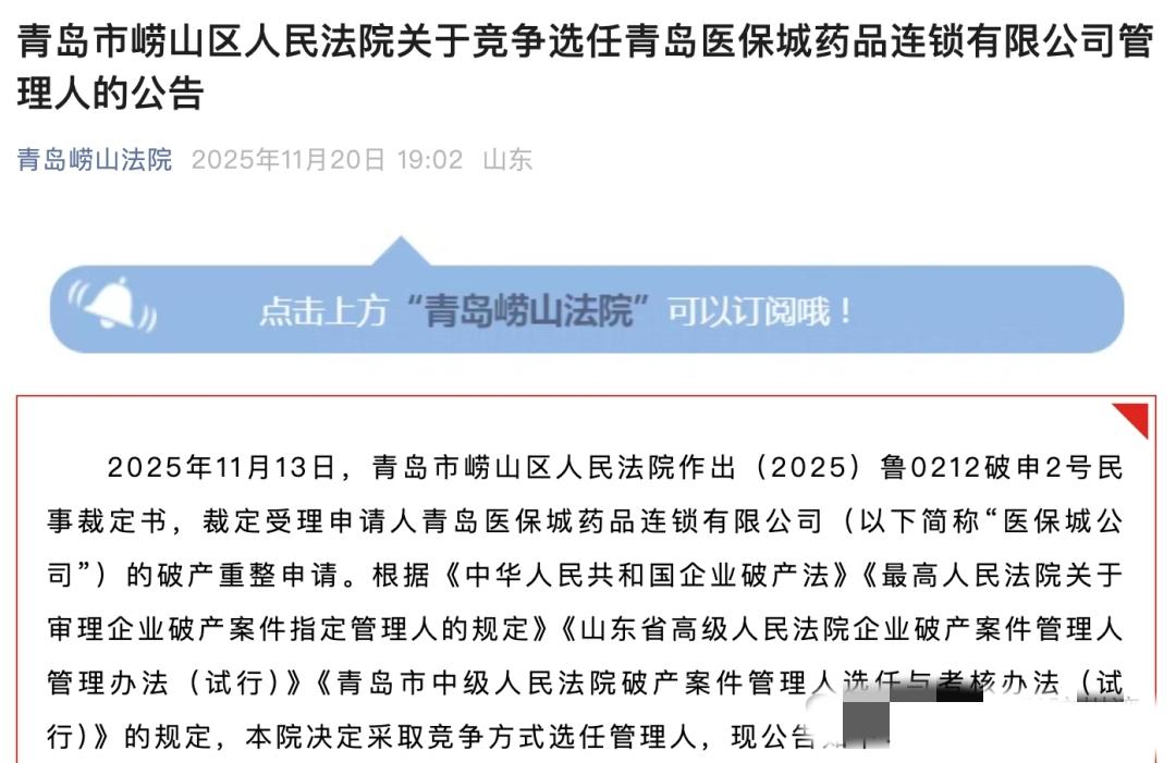 冬日生活打卡季青岛医保城药品连锁有限公司正式破产重整,将以竞争方式公开选任管理人。青岛医保城成立于2003年7月11日,注册资本1亿元,股东为马守军、山东医保广告有限公司,企业类型为其他有限责任公司。