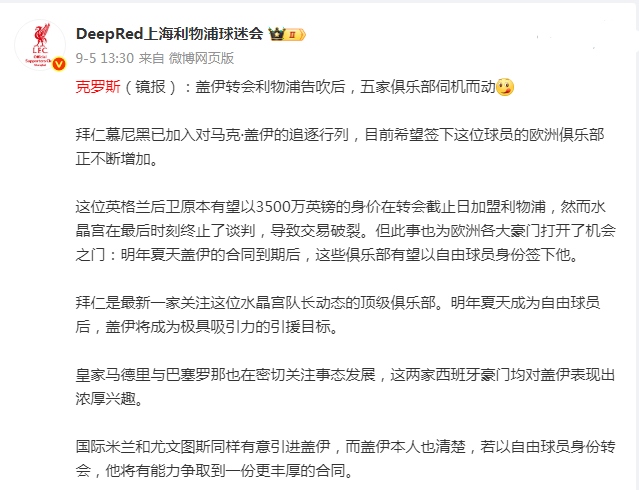 更新:利物浦若想在 1 月份签下盖伊,必须斥巨资。尽管不到三个月前他们曾距离完成交易仅一步之遥,但如今还要面临来自海外俱乐部的额外竞争。包括皇马、巴萨、拜仁和国际米兰在内的海外追求者,从 1 月 1 日起便可展开谈判,而球员也能在本赛季结束前签订预合同。自由球员通常能获得更高薪资,且皇马和巴萨深知盖伊持有科特迪瓦护照,这意味着他在西班牙联赛中可被算作欧盟球员(无需占用非欧名额)。水晶宫需在两个选项间权衡:要么自由离队一无所获,要么在 1 月以折价出售换取转会费,同时还要考虑其对球队的价值 —— 他的实力能提升球队的竞争力。尽管合同即将到期,但利物浦可能仍需开出接近今夏的报价,才能同时打动球员和水晶宫。