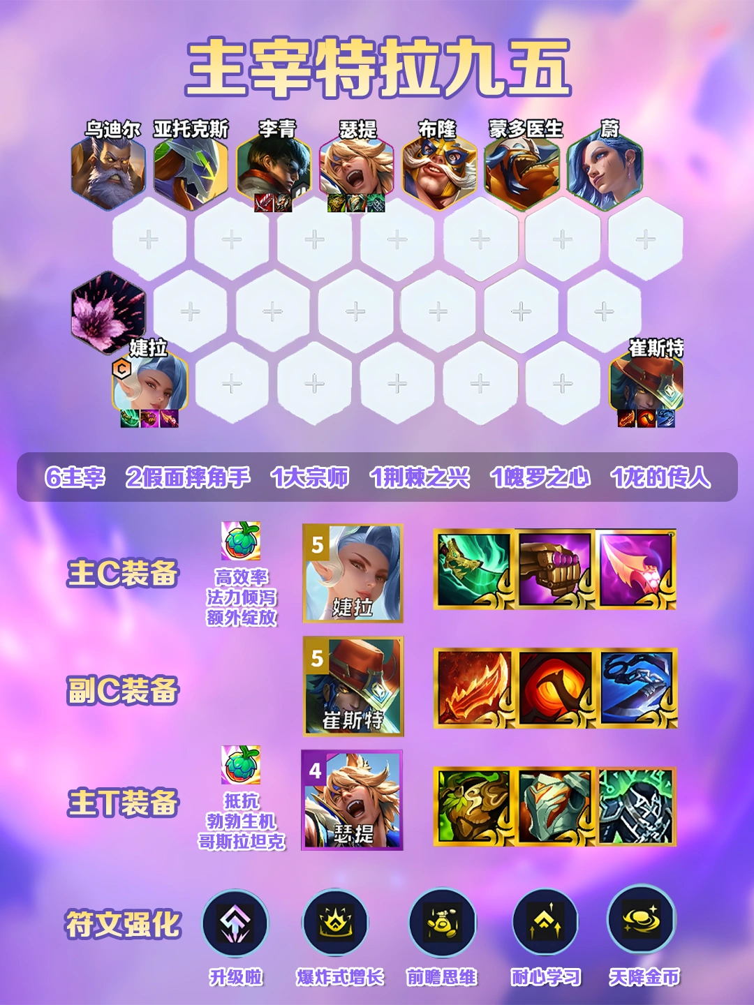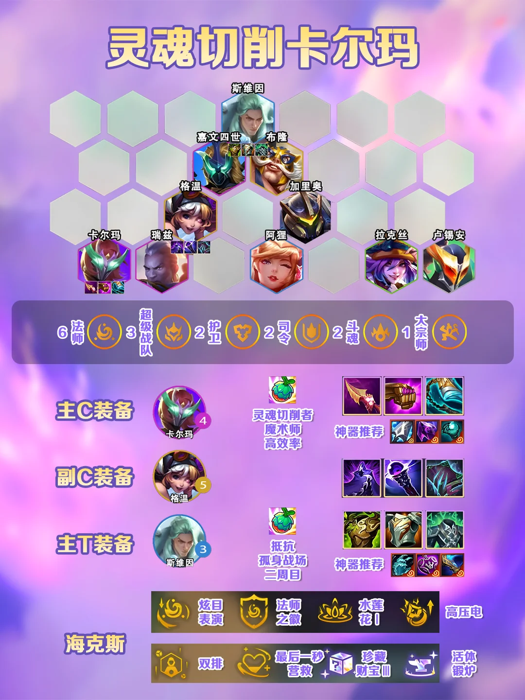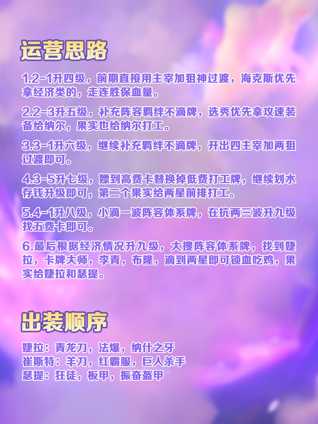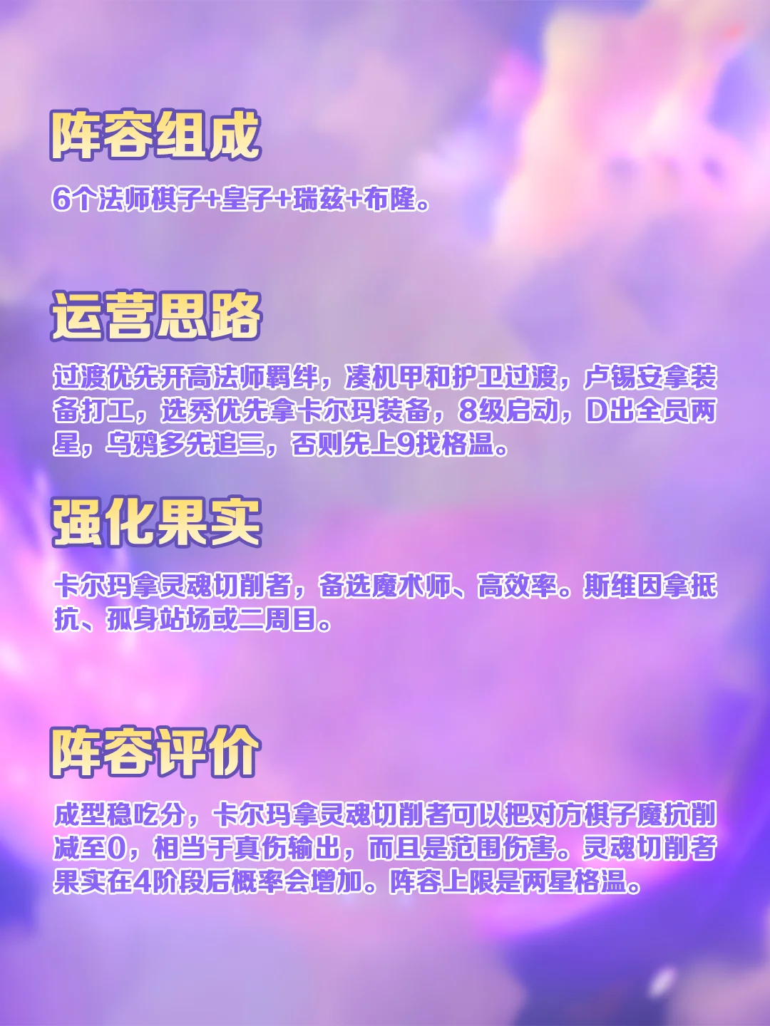 【运营思路】过渡优先开高法师羁绊,凑机甲和护卫过渡,卢锡安拿装备打工,选秀优先拿卡尔玛装备,8级启动,D出全员两星,乌鸦多先追三,否则先上9找格温。
