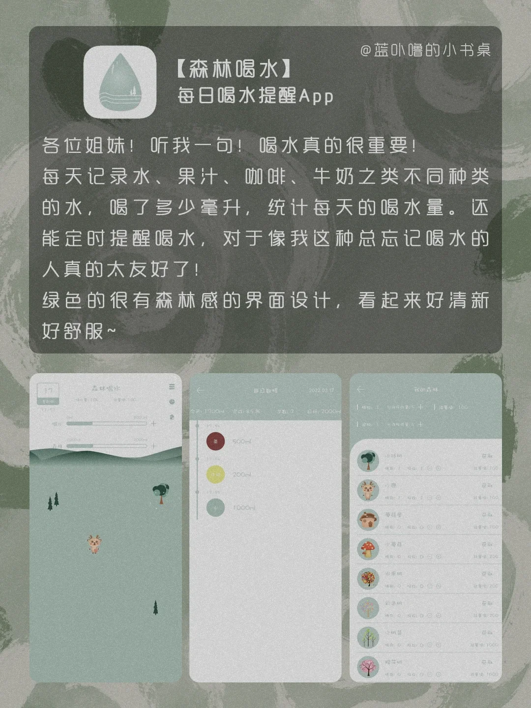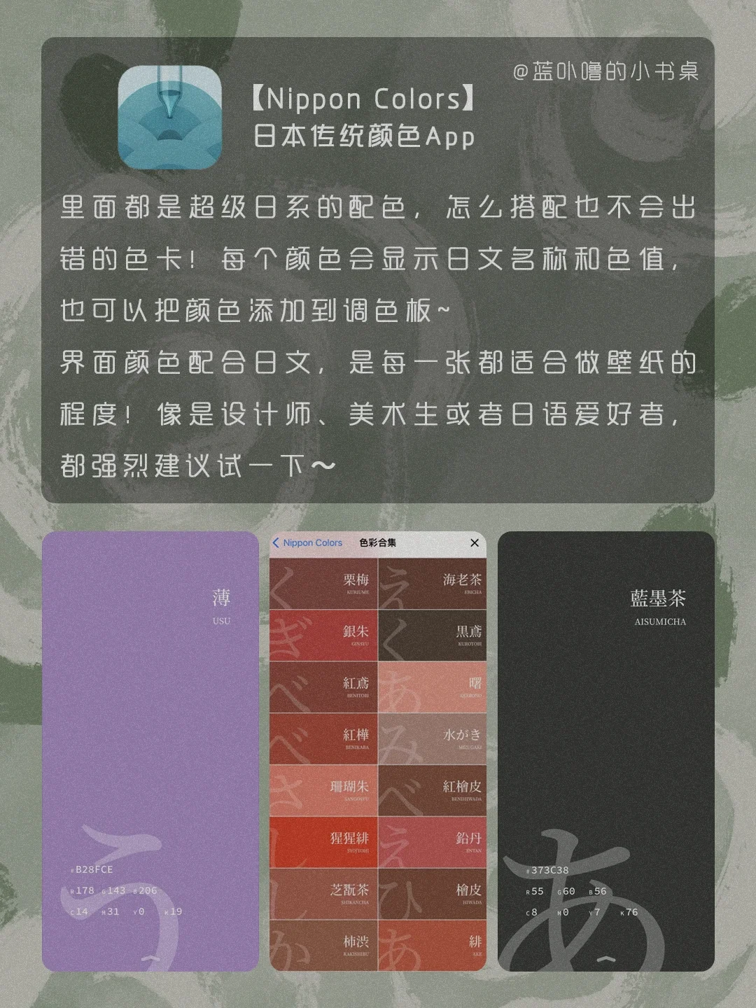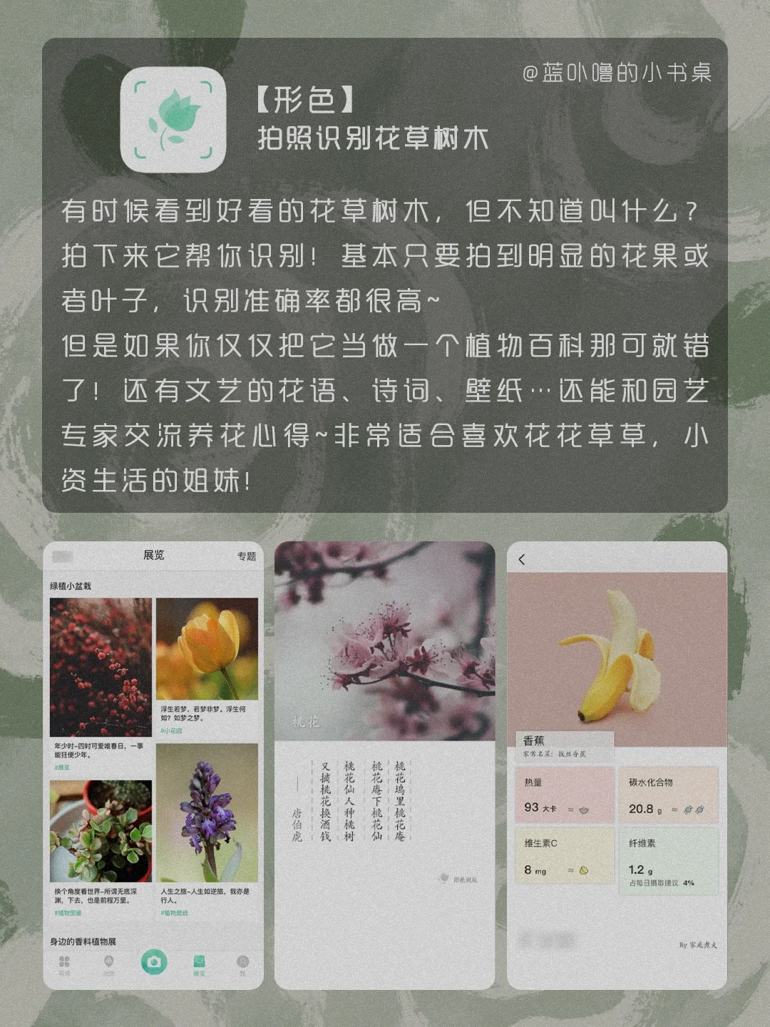 HI,我是蓝卟噜的小书桌[自拍R] 一些颜值很高又很实用的App❗️ 让生活方方面面,都精致的刚刚好🥰 积极向上的生活,热气腾腾的活着 爱自己的最高级❤ 🍃时光记账 🍃Nippon Colors 🍃形色 🍃 Kiinii 🍃风晴 🍃Breathable 🍃森林喝水
