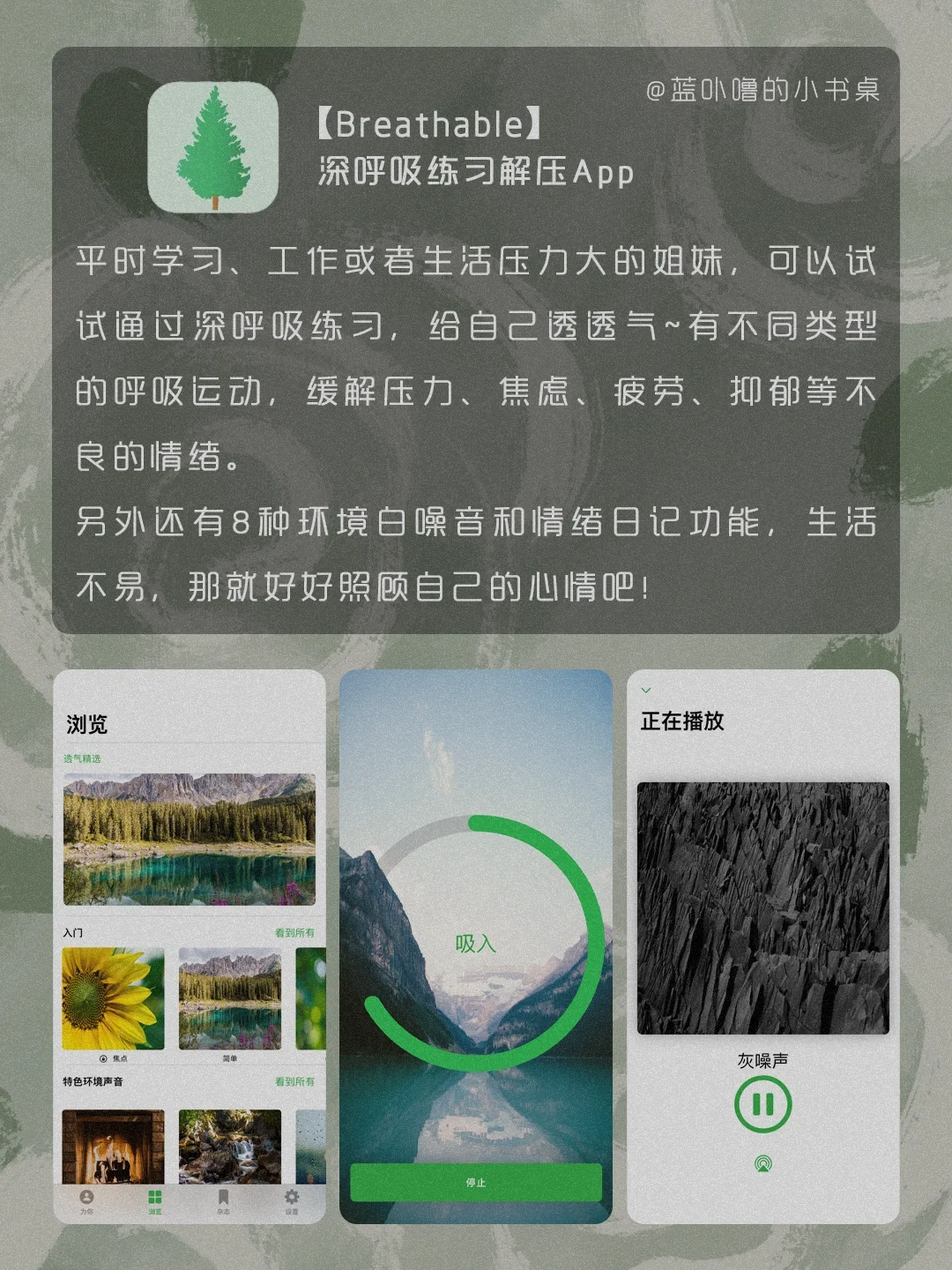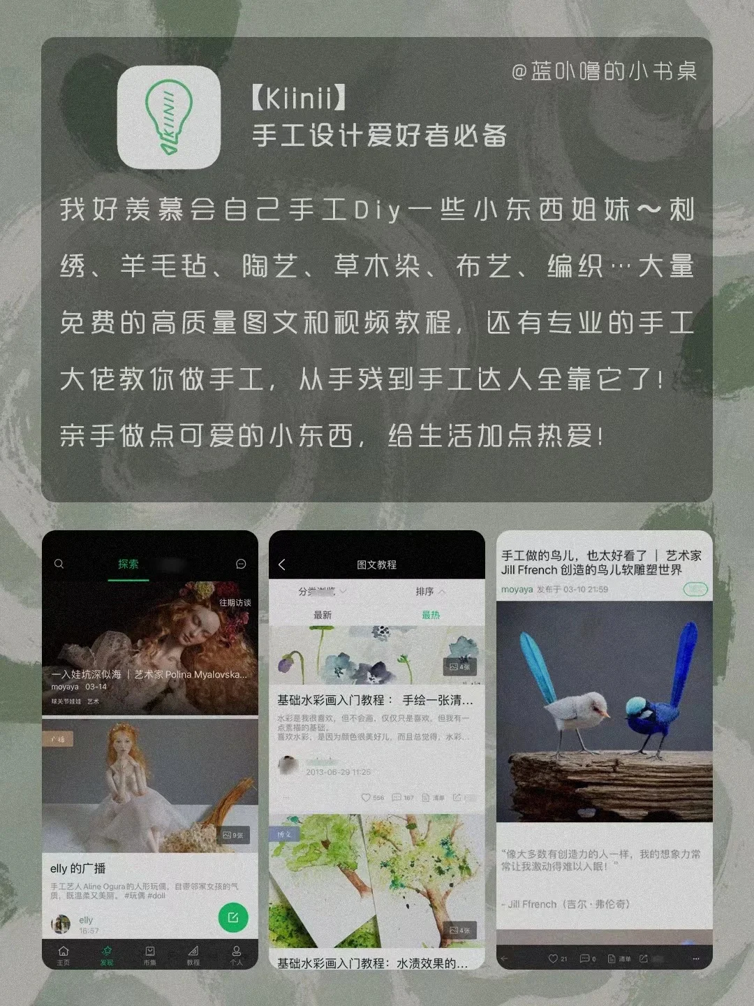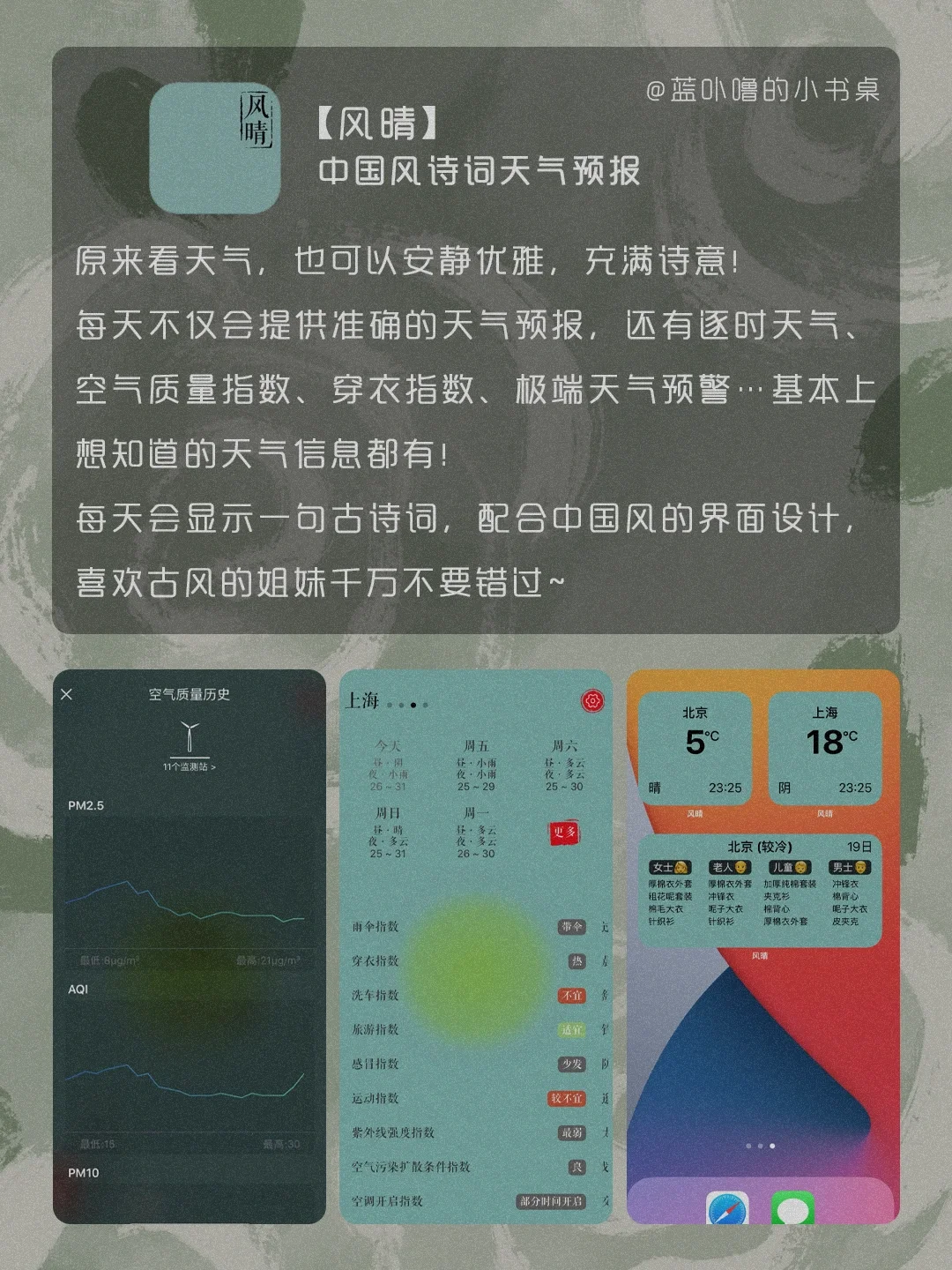 HI,我是蓝卟噜的小书桌[自拍R] 一些颜值很高又很实用的App❗️ 让生活方方面面,都精致的刚刚好🥰 积极向上的生活,热气腾腾的活着 爱自己的最高级❤ 🍃时光记账 🍃Nippon Colors 🍃形色 🍃 Kiinii 🍃风晴 🍃Breathable 🍃森林喝水