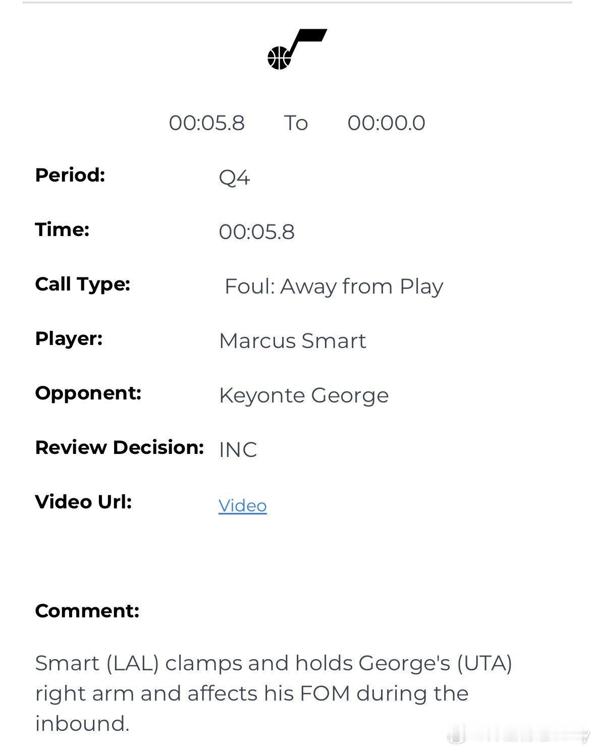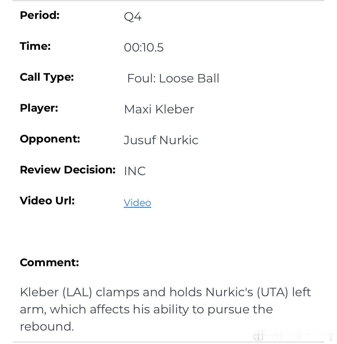 湖人爵士最后两分钟裁判报告,两次均对爵士不利。漏判1:比赛最后10.5秒,湖人领先1分,克莱伯夹住并拉了努尔基奇左臂,此动作影响了努尔基奇争抢篮板的能力,此为犯规漏吹。漏判2:比赛最后5.8秒,湖人108-106领先2分,爵士发界外球时,斯玛特夹住并拉住基昂特乔治的右臂,影响了其自由移动的能力,此为漏判。导致爵士输球。