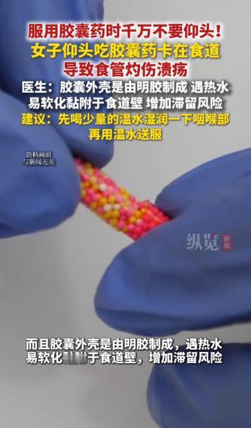 悲剧还是发生了!近日,云南,一女子生病吃胶囊,仰头吞咽时,胶囊却卡在了食道内,本应在胃里面释放的药物提前释放,导致女子食管被烫伤,造成严重的溃疡!家人急忙将她送去医院治疗。医生:吃胶囊应保持平头或略微低头。 急诊室里,蒋女士(化名)捂着胸口直冒冷汗,连咽口水都疼得龇牙,谁能想到,不过是吃粒感冒药,怎么就把自己折腾进了医院。 事情得从那天上午说起,蒋女士感冒发烧,医生开了几粒胶囊,吃药时,她跟平时一样,仰着脖子猛灌一大口水,觉得这样药能顺顺利利滑进肚子,可这次不一样,刚咽下去没几秒,胸口就传来一阵异物感,还带着隐隐的疼。 刚开始她还没当回事,想着可能水喝少了,又接了杯温水往下冲,哪知道这一冲,疼得更厉害了,短短几分钟,胸骨后像有团火在烧,连呼吸都跟着不顺畅,家人一看情况不对,赶紧送她去了医院。 做胃镜的时候,医生发现蒋女士食道黏膜已经被灼伤,是因为吃的胶囊里面的药渗出来烧的,医生的话让蒋女士和家属都懵了,吃了几十年药,一直以为仰头喝水送药最管用,不料却闯了祸。 其实大部分人都跟蒋女士一样,有这个误区,接诊医生解释,咱们的食道不是直的,仰头的时候食道角度会变,像胶囊或者药片这类的药物很容易就卡在半路上。 尤其是胶囊,外壳轻,容易浮在水上,要是姿势不对、水喝得不够,特别容易在食道里提前崩解。 正确的做法其实特别简单,保持平视,或者稍微低点头,喝足够的水,让胶囊顺着水流自然滑下去,要是药片大或者有点干,更得多喝几口,让药在嘴里和食道里润透了再咽。 蒋女士后来接受了治疗,灼伤慢慢在恢复,只是这段时间得吃清淡软烂的东西,刺激性的食物一点都碰不得,她自己也后悔,要是早知道仰头吞药不对,也不会遭这份罪。 这事被报道后,好多网友都在评论区说自己有过类似经历,有人说每次吞胶囊都感觉卡喉咙,还以为是药太大,还有人说吞药时下意识就仰头,根本没想过这是错的。 一些医护人员也出来科普,胶囊因为外壳轻,更容易浮在水上,所以吞的时候更需要足够的水量和正确的姿势,吞药太快、喝水太少、姿势不对,都会增加卡喉的风险。 尤其是缓释片、肠溶片这些特殊剂型,一旦在食道里提前破了,轻的会灼伤黏膜,严重的可能会造成深度溃疡,影响食道功能。 所以说啊咱们平时吃药,总觉得是小事,没人会特意去想姿势对不对,可就是这些不起眼的小习惯,藏着不少安全隐患,要是吞药时感觉卡了,别硬往下咽,可以多喝几口温水试试,要是还不舒服,赶紧去医院,别拖着。 蒋女士的经历也算给大家提了个醒,吃药不是小事,找对方法、养成好习惯,才能让药治病,别让药再添新麻烦。 对此,你还有什么看法呢? (信息来源 :总览新闻 )
