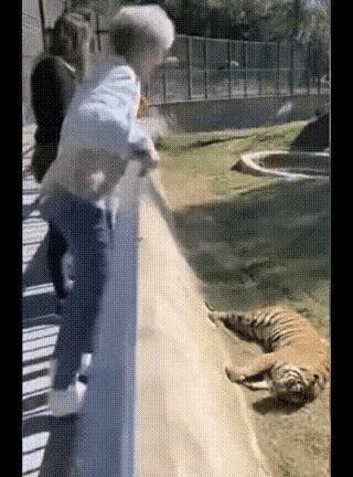 给老虎整懵了,话说这护栏也太糊弄事儿了,这下子要出大事了,最值得敬佩的就是后来跳下来的黑衣女子,可能是白发老太太的女儿吧,面对肉眼可见的危险,依然挺身而出,勇气可嘉,做法欠佳,希望她们母女平安无事,毕竟老虎不是吃素的,替她们俩捏着一把汗!