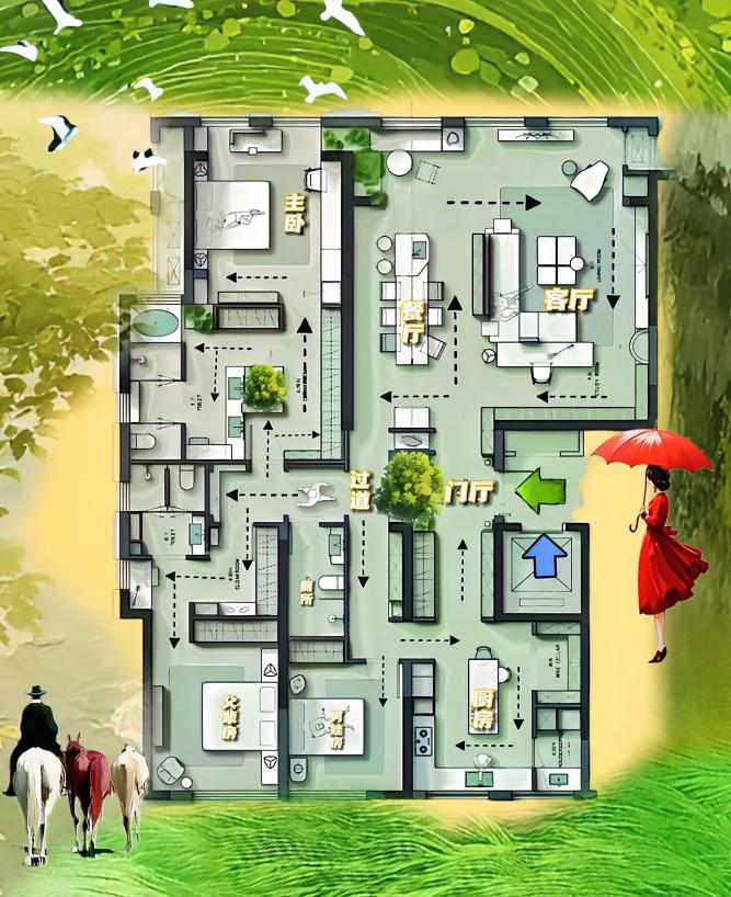天呐!跟电影太适配,痛改三居绝美啊,居住一百平的我,看到230㎡之后感觉像进了酒店。 说话来四点,纳阳台入客厅,变身大横厅。小玄关扩宽大景观,主打大洄游。小书房入编老人房,升级大套房! 最后厨房纳小阳台,直接当开放式的西厨,顺手牵出两个杂物盒子,家政与贮物,有生话哲的好空间! 整合思路真是太牛了,可借鉴,四条动线盘活大三居,如欣赏一副会动的平面图! 其实就是五口人,三条安静线和一条动线组成的,生活轨迹,从门口到卧室属于休息区,从门厅到厨房,开始煮鱼的一个过程! 上半边打盹,下半边居家版的美食一条街! 背后是大平层,给三代同堂提供“最体贴”的生活服务,不冷落身边每一个空间感觉。 虽然我本人,非常喜欢这种生活满当当布局,也得适应大伙儿的习惯,却是最对得起大平层的那种!