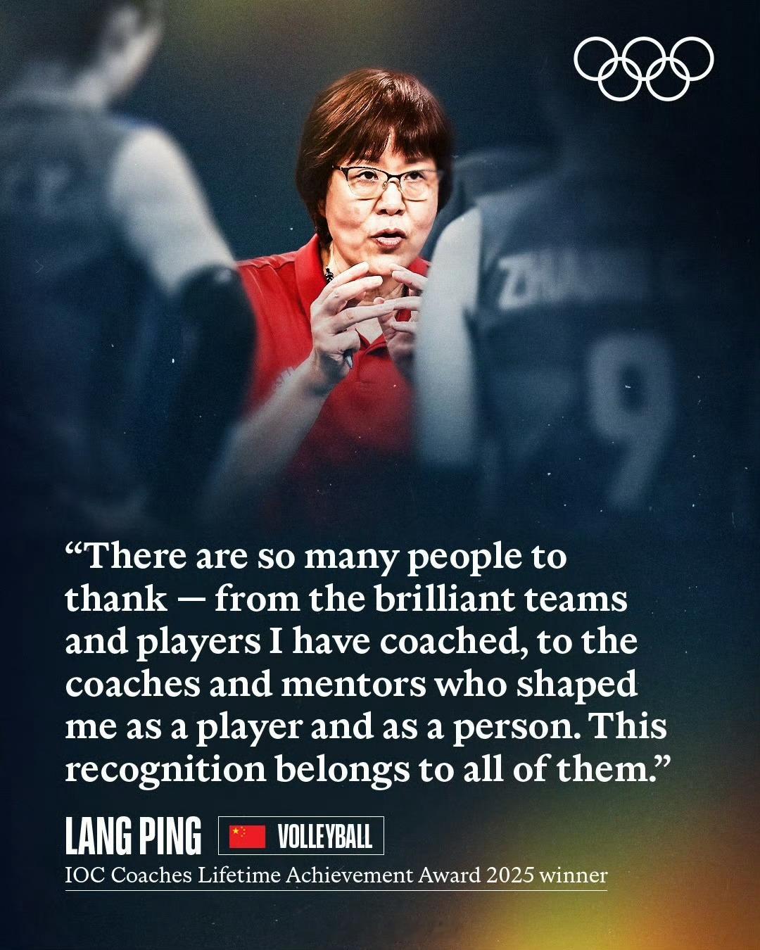 国际奥委会官方宣布,前中国女排主教练郎平与古巴摔跤教练劳尔·德·赫苏斯·特鲁希略·迪亚斯获得国际奥委会颁发的教练终身成就奖。现年64岁的郎平在1984年洛杉矶奥运会上帮助中国女排夺得奥运会冠军,1987年转型教练之后,在1996年亚特兰大奥运会上率领中国女排拿到银牌。之后,郎平执教美国女排四年,率领美国队拿到2008年北京奥运会银牌。之后郎平回到中国,再次执教中国女排,并在2016年里约奥运会上率领中国女排夺得金牌,她也就此成为历史上第一位以运动员和教练员身份均夺得排球奥运金牌的人。颁奖仪式上,郎平发表了获奖感言,她说:“获得这个奖项是莫大的荣幸。我衷心感谢国际奥委会和国际排联对我执教工作的认可。我要感谢的人太多了——从我在中国、意大利和美国执教过的那些优秀的球队和球员,到从我接触这项运动之初就塑造我球技和人格的教练和导师们。这份荣誉属于他们所有人。”