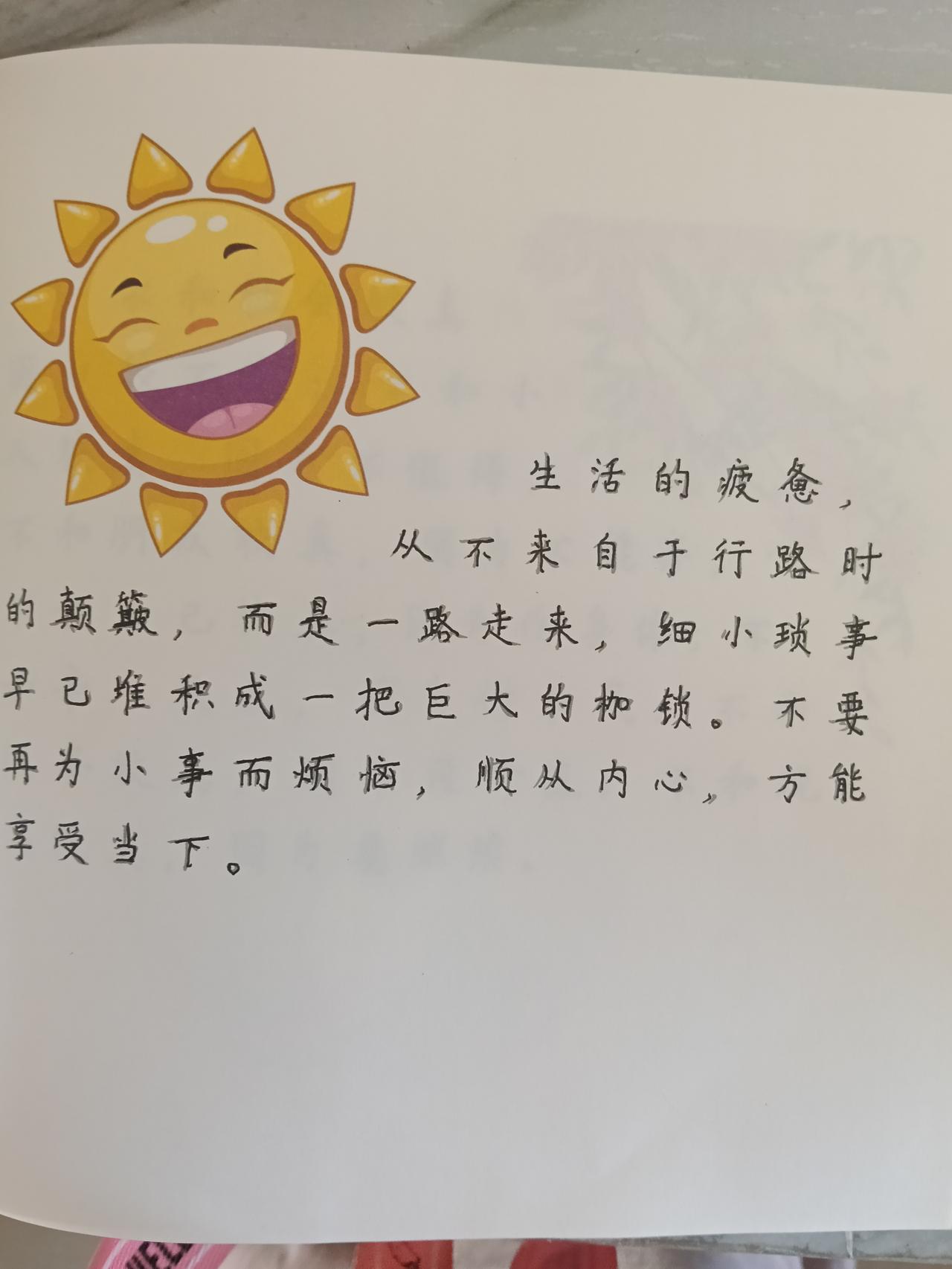 【抄书打第十天,生活感悟】 疲惫的真正来源,从来不是路上的颠簸坎坷,而是那些看似微不足道的琐碎日常,在不知不觉中堆积成心灵的枷锁。✨ 与其为小事纠结内耗,不如学会放下执念,聆听内心的声音。当你开始顺从自己的节奏,才能发现:当下每一刻,都藏着生活馈赠的宁静与美好。 💫愿你:卸下琐碎,轻装前行,与自在相逢。抄书打卡 每日抄写 打卡抄书 抄书感悟