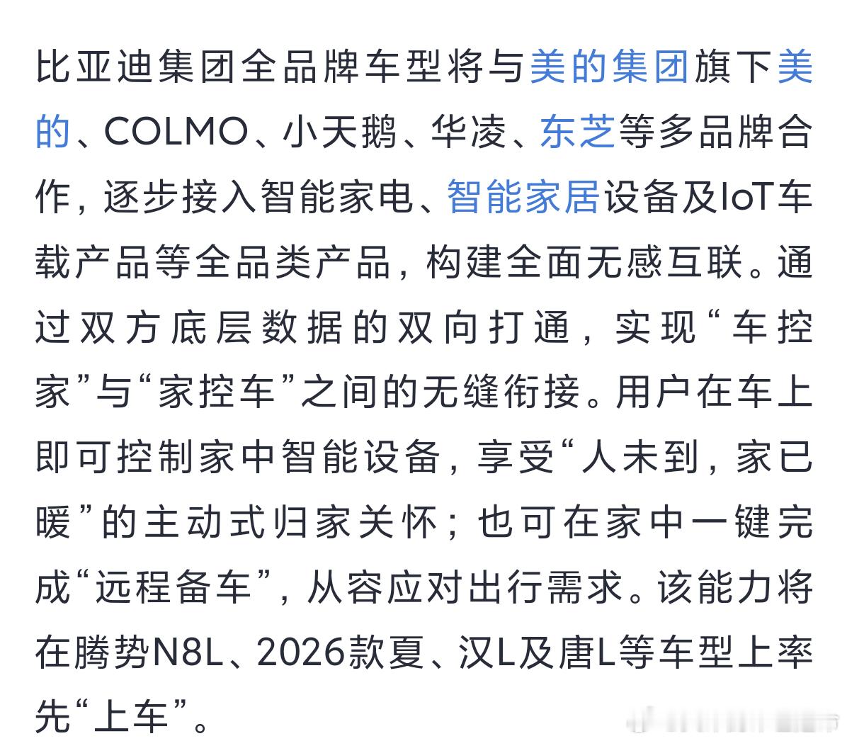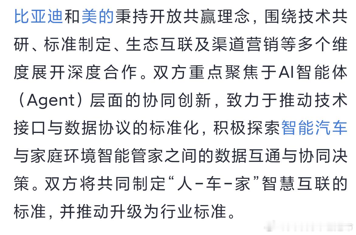 看了下比亚迪和美的的合作内容,这次是真合作不是敷衍了事双方以一种合作的方式实现了人车家生态,还是挺有意思的,汽车开始和手机争夺话语权