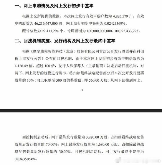 超480万户疯抢摩尔线程 中签率出炉摩尔线程日前正式启动申购,股票代码为“688795”,上市后将成为“国产GPU第一股”。本次发行价为114.28元/股,为今年以来最高发行价的新股,中一签需缴款57140元。摩尔线程IPO预计募集资金总额为80亿元,将成为今年以来A股第二大IPO项目。摩尔线程公告,根据上交所提供的数据,本次网上发行有效申购户数为482.66万户,有效申购股数为462.17亿股,网上发行初步中签率为0.02423369%。由于本次网上发行初步有效申购倍数约为4126.49倍,超过100倍,发行人和保荐人(主承销商)决定启动回拨机制,对网下、网上发行的规模进行调节。回拨机制启动后:网下最终发行数量为3,920.00万股,占扣除最终战略配售数量后发行数量的70.00%;网上最终发行数量为1,680.00万股,占扣除最终战略配售数量后发行数量的30.00%。回拨机制启动后,网上发行最终中签率为0.03635054%。