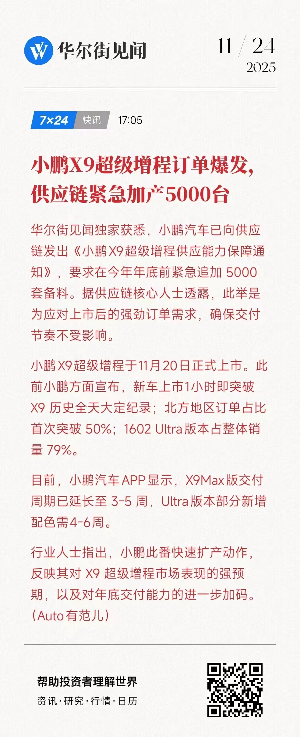 小鹏X9超级增程订单爆发!小鹏已向供应链发出“紧急加产”邮件,目标年底前新增5000份备料,全力冲刺交付,让用户尽早提车!上市当天,小鹏X9超级增程1小时即打破X9历史全天大定纪录,目前,小鹏汽车APP显示,Ultra版交付周期已全面延长至5-7周订单远超预期,小鹏打响“交付保卫战”!